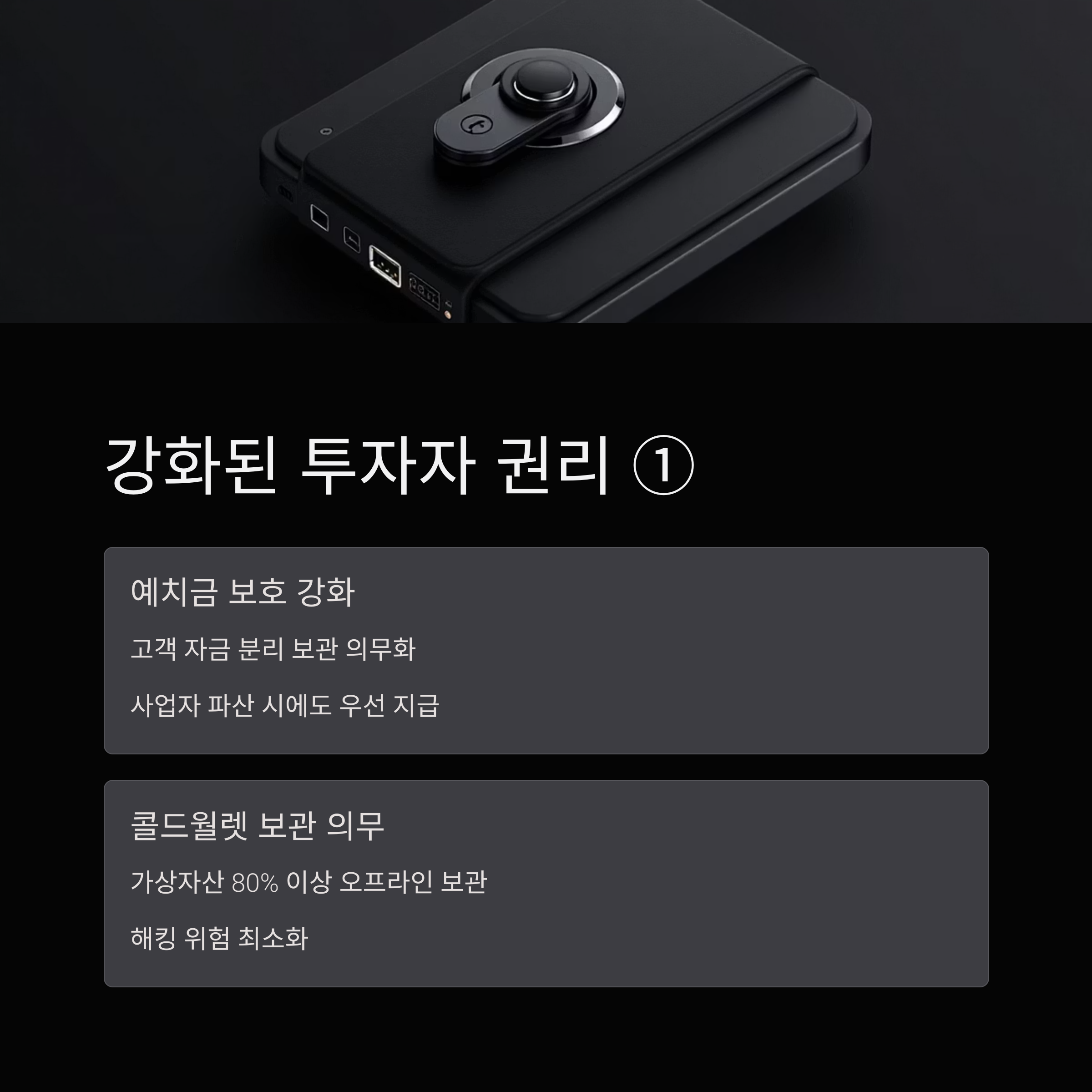 • 가상자산 안전한 보관 의무: 가상자산 사업자는 이용자의 가상자산 중 일정 비율 이상(경제적 가치의 80% 이상)을 인터넷과 분리된 콜드월렛(Cold Wallet)에 보관해야 합니다. 콜드월렛은 해킹 위험이 현저히 낮아, 해킹이나 전산 장애와 같은 사고 발생 시에도 투자자들의 자산을 안전하게 보호할 수 있는 중요한 장치입니다.
