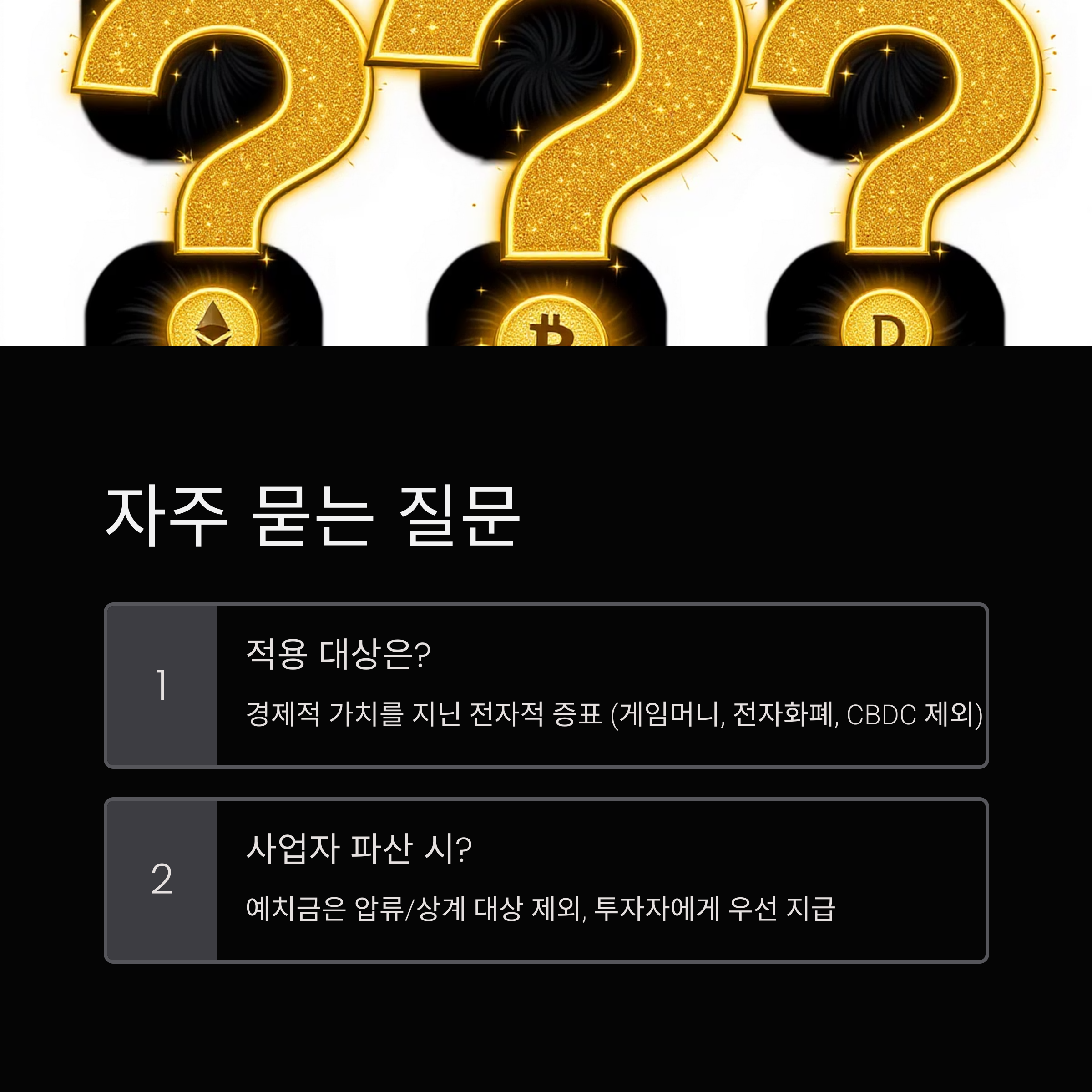 Q2: 모든 가상자산이 이 법의 보호를 받나요? A2: 경제적 가치를 지닌 전자적 증표로서 전자적으로 거래 또는 이전될 수 있는 '가상자산'이 이 법의 적용 대상입니다. 단, 한국은행이 발행하는 CBDC(중앙은행 디지털화폐), 게임머니, 전자화폐, 전자등록주식, 전자어음, 전자선하증권, 전자채권, 모바일 상품권 등은 가상자산의 범위에서 제외됩니다.