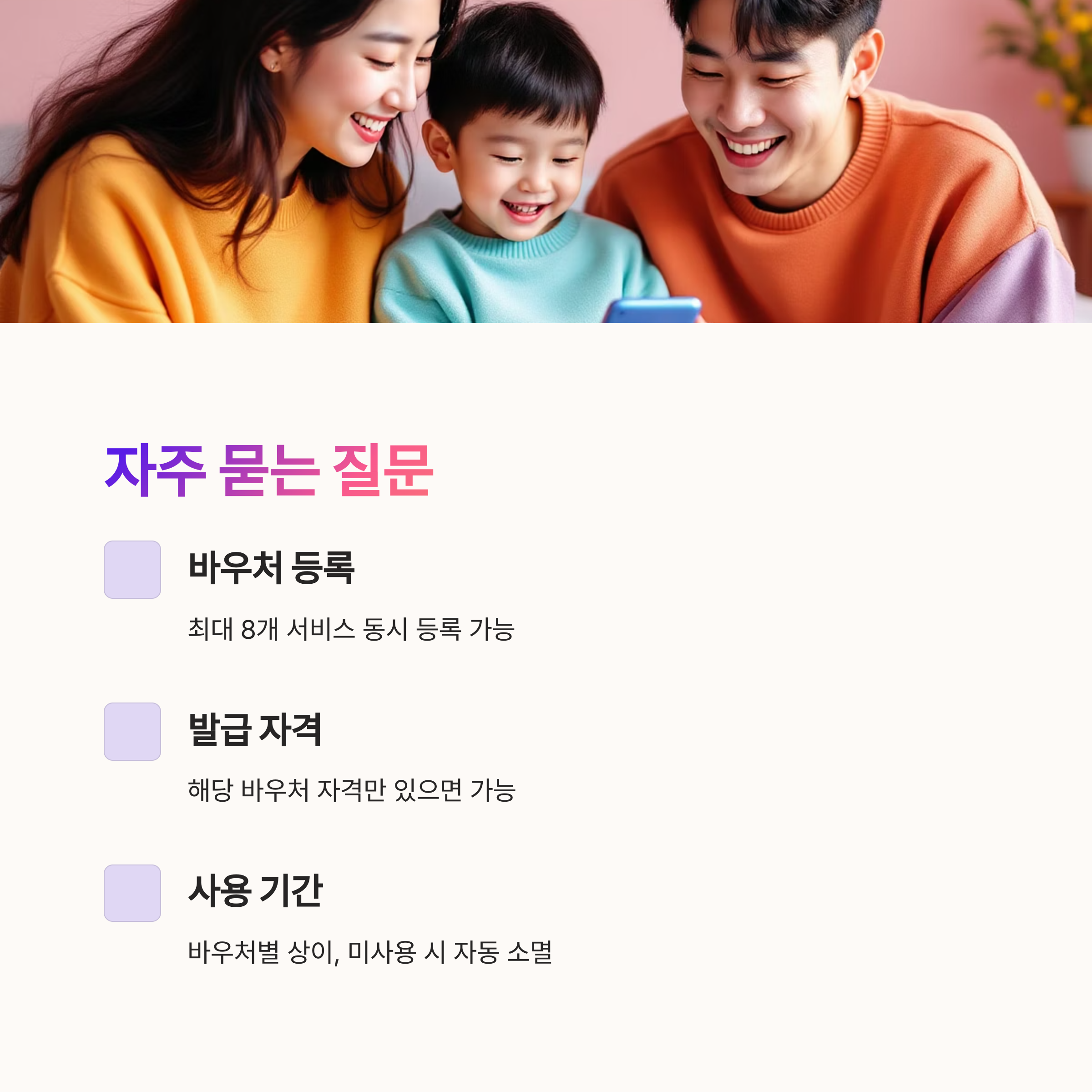 - 통합 관리: 최대 8종류의 바우처를 단일 카드로 등록·사용.