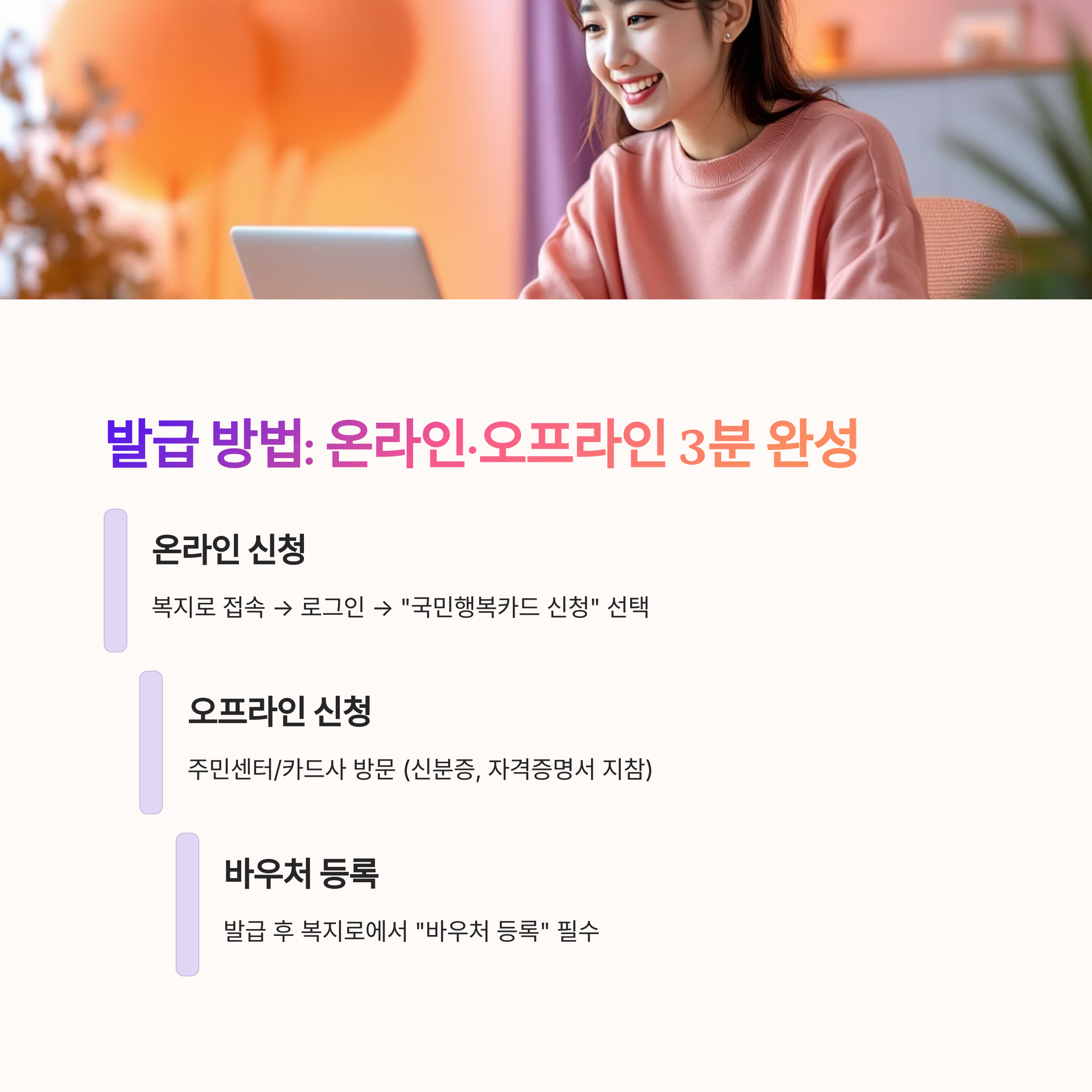 - 복지로(www.bokjiro.go.kr) 접속 → 로그인 → "국민행복카드 신청" 선택.