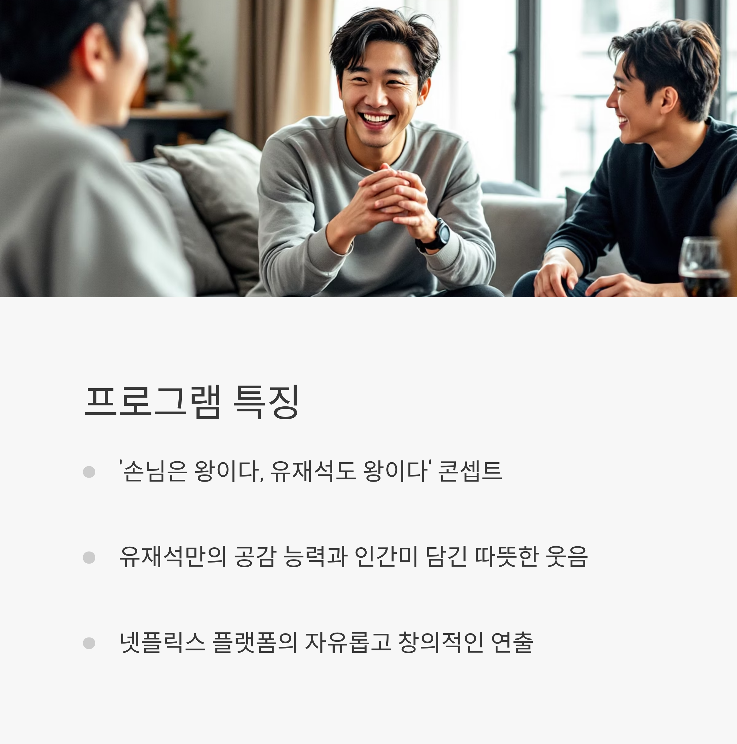 국민 MC 유재석이 넷플릭스와 손잡고 새로운 민박 예능 '유재석 캠프'를 선보인다는 소식, 다들 들으셨나요? '손님은 왕이다, 유재석도 왕이다'라는 신선한 콘셉트로 벌써부터 많은 기대를 모으고 있는데요. 넷플릭스 오리지널 예능인 만큼, 기존 방송에서는 볼 수 없었던 특별한 재미를 선사할 것으로 예상됩니다. 특히 기안84의 '대환장 기안장'에 이어 넷플릭스 민박 유니버스의 새로운 장을 열 유재석 캠프! 과연 어떻게 이 특별한 캠프에 참여할 수 있을지, 지금부터 자세히 알아보도록 하겠습니다.