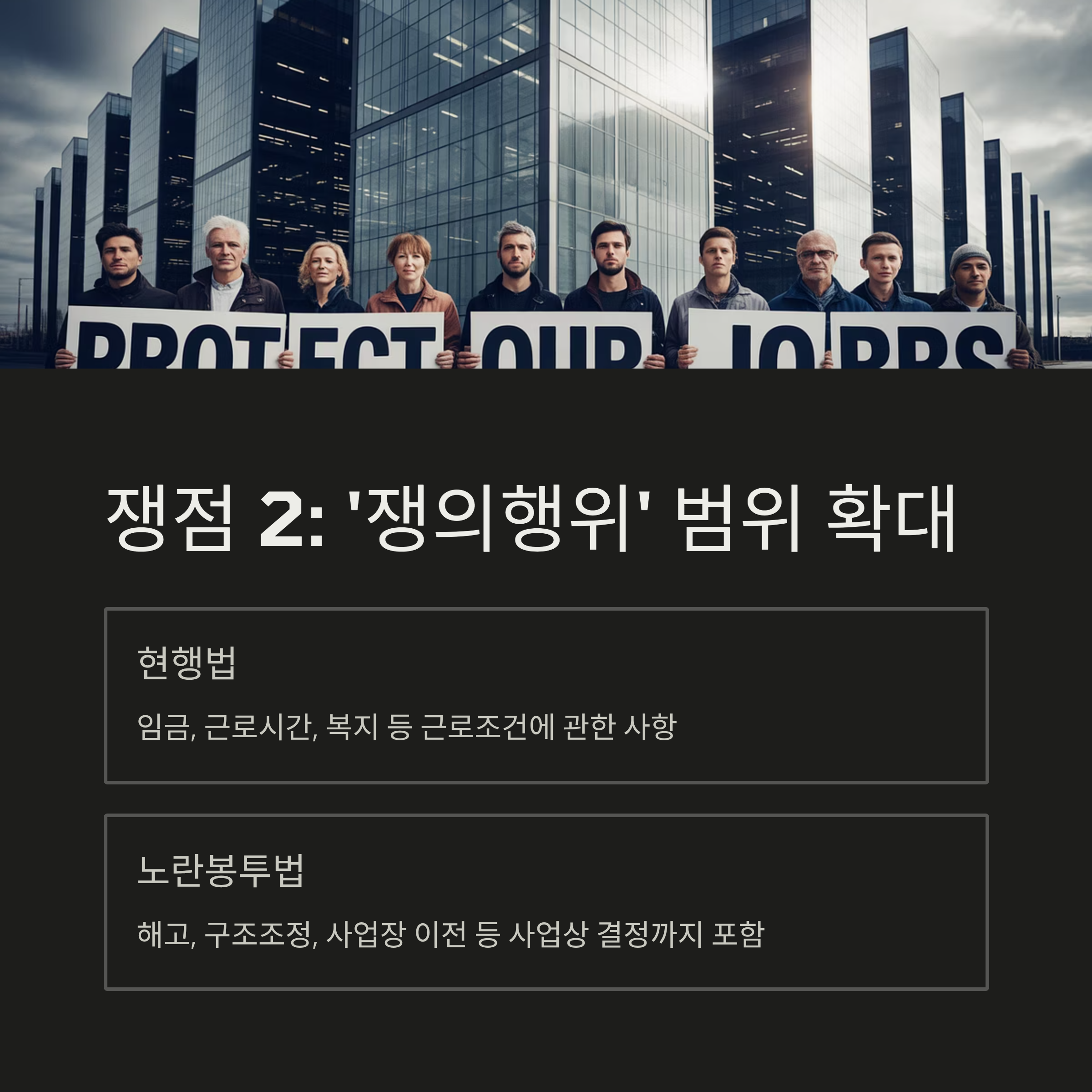 노동계는 “정리해고나 사업장 이전은 노동자들의 생존권이 달린 문제인데, 이를 교섭 대상에서 제외하는 것은 부당하다”며 쟁의행위 범위 확대의 필요성을 주장합니다. 회사의 일방적인 결정으로 인해 삶의 터전을 잃을 위기에 놓인 노동자들이 목소리를 낼 수 있는 최소한의 권리라는 입장입니다.