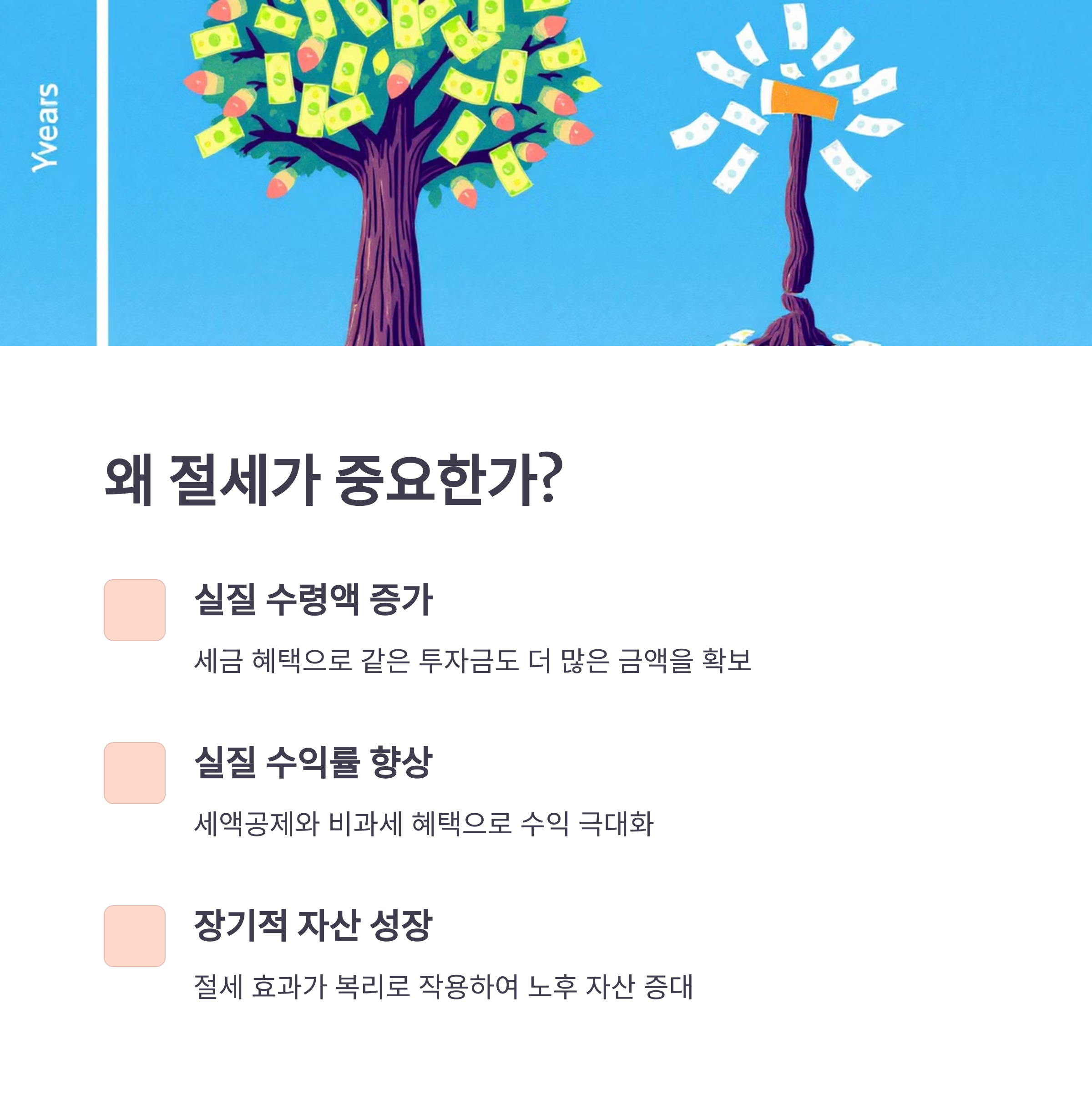 노후 준비를 위해 자산을 키우는 것도 중요하지만, 세금 절약을 통해 실질적인 수령 금액을 늘리는 것이 더 중요합니다. 예를 들어 같은 금액을 투자하더라도 세금 혜택을 받으면 더 많은 돈을 손에 쥘 수 있기 때문이죠.