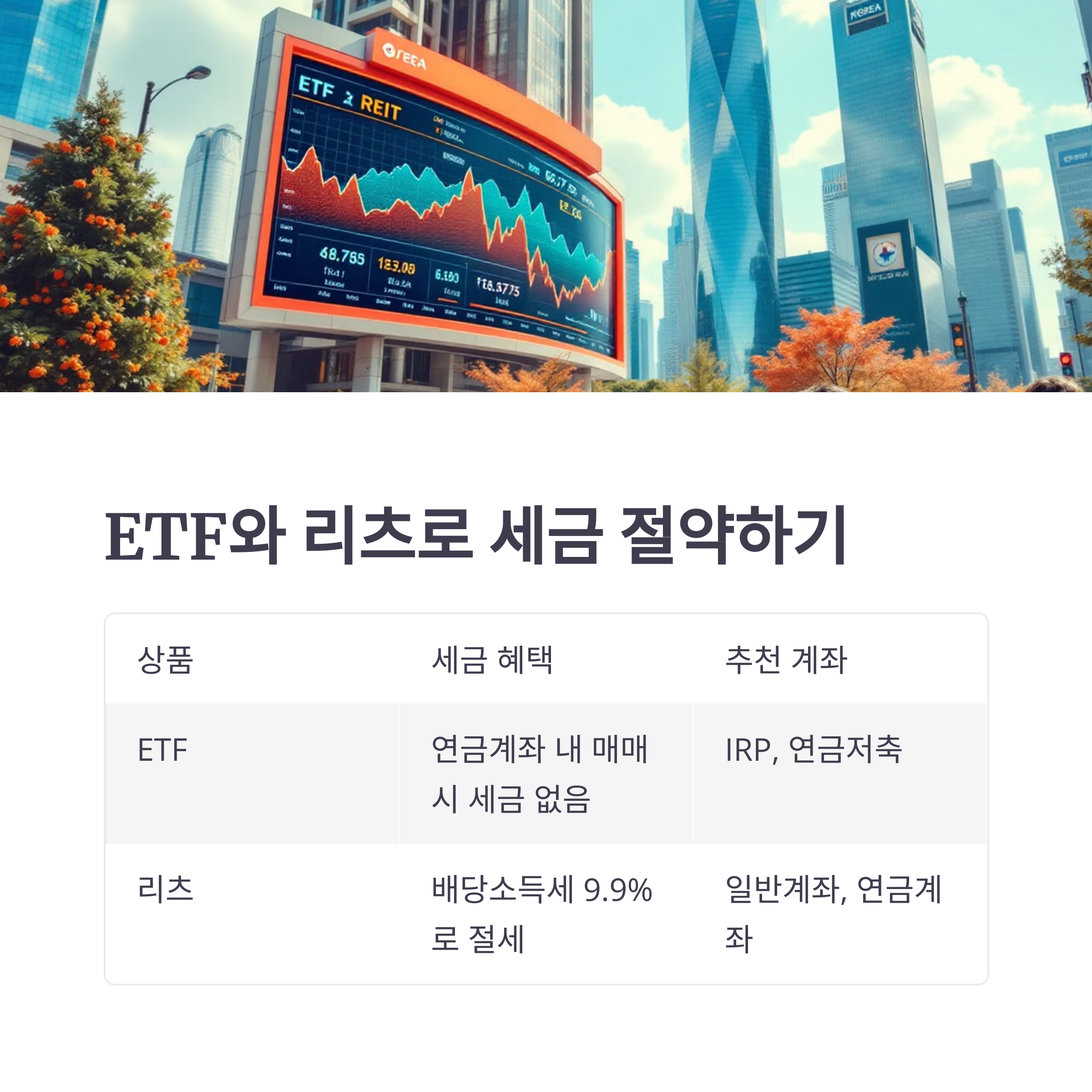 ETF(상장지수펀드)와 리츠(부동산투자회사)는 배당소득세를 절약할 수 있는 절세 투자 상품입니다. 특히 연금 계좌(연금저축, IRP)에서 ETF와 리츠를 운용하면 세금 부담 없이 자산을 성장시킬 수 있습니다.