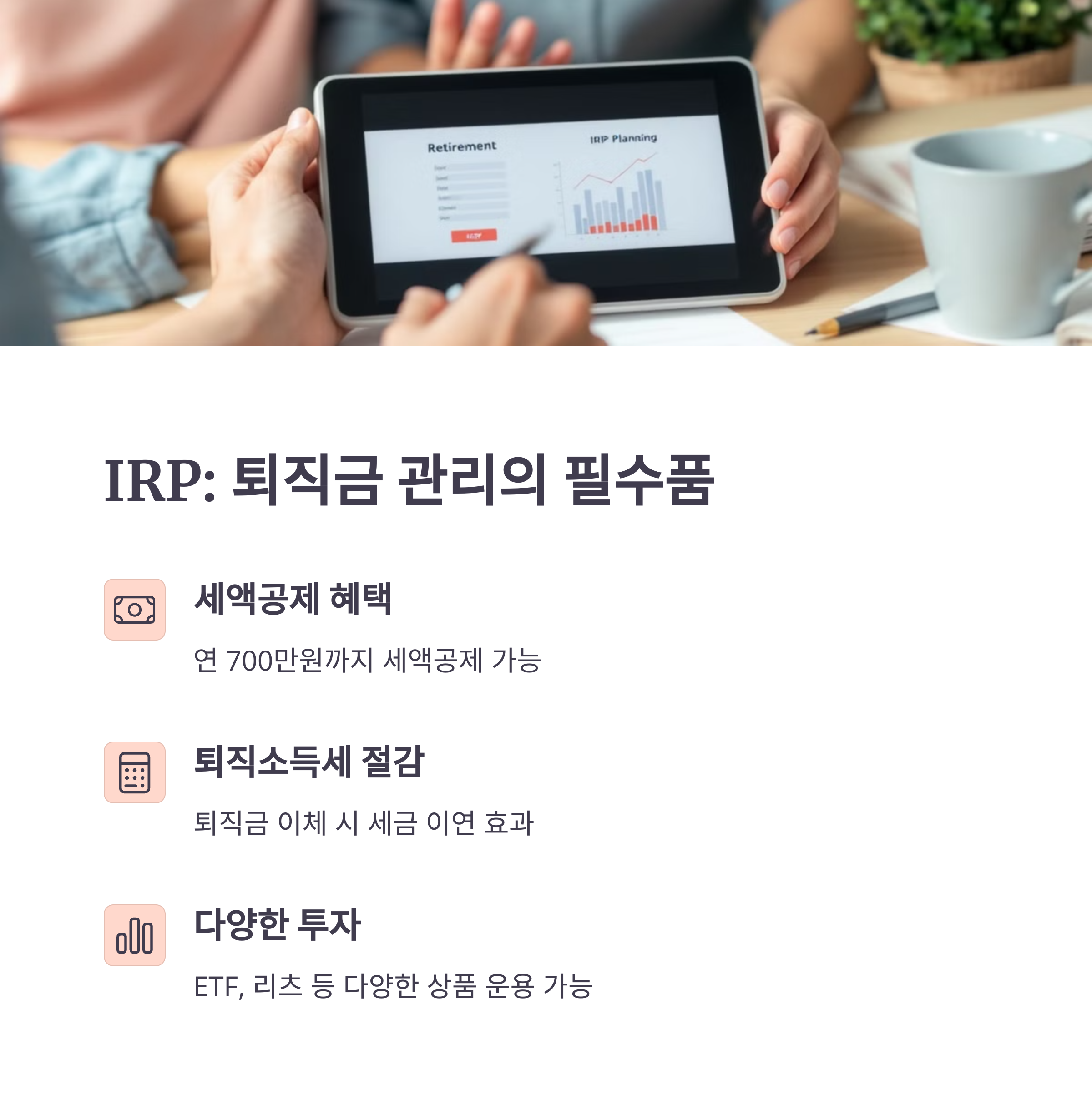 IRP는 퇴직 이후 연금으로 받을 경우 세금 부담이 낮아지며, 한 번 가입하면 장기적으로 활용할 수 있는 강력한 절세 수단입니다.
