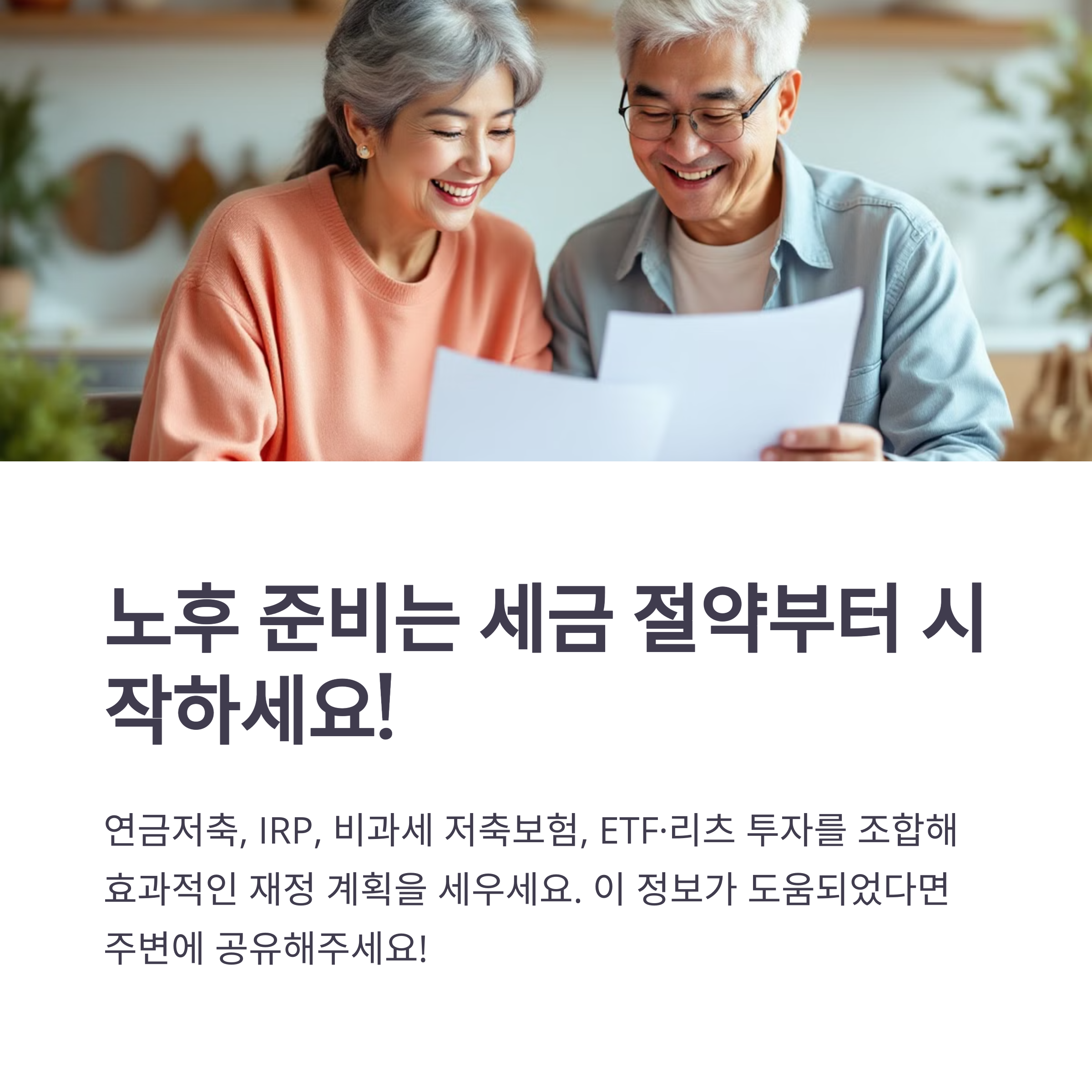 노후 준비는 단순히 돈을 모으는 것이 아니라, 어떻게 효율적으로 운영할지 전략적으로 접근해야 합니다. 특히 세금 절약을 통해 더 많은 자산을 지킬 수 있는 절세형 금융상품을 잘 활용하는 것이 중요합니다. 연금저축, IRP, 비과세 저축보험, 그리고 ETF·리츠 투자까지 다양한 방법을 조합하면 더욱 효과적인 재정 계획을 세울 수 있습니다.