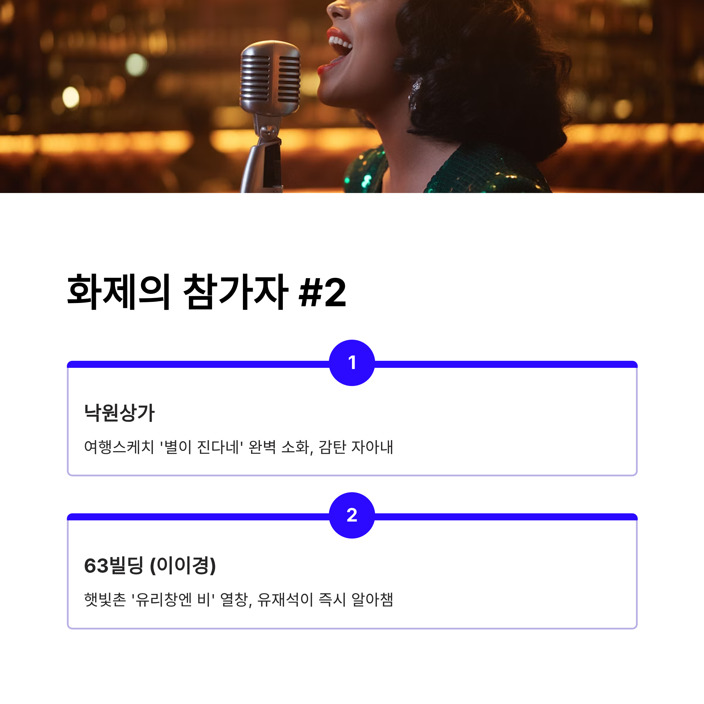 아직 공개되지 않은 정체도 많지만, 현재까지 드러난 참가자들의 면면만으로도 이번 ‘놀뭐’ 서울가요제가 얼마나 풍성하고 볼거리가 많을지 짐작할 수 있습니다. 비록 탈락했지만 멤버인 이이경과 주우재, 그리고 레전드 가수 진성까지, 이들의 참여는 프로그램에 재미와 감동을 동시에 선사했습니다. 특히, 마지막 참가자 ‘공작상가’는 조정현의 ‘그 아픔까지 사랑한 거야’를 선곡했는데, 첫 소절부터 박명수임을 알아차린 유재석과 하하의 반응은 큰 웃음을 자아냈습니다. 박명수는 얼굴을 가렸음에도 불구하고 정체를 숨기지 못하는 코믹한 상황을 연출하며 또 하나의 명장면을 만들어냈습니다.