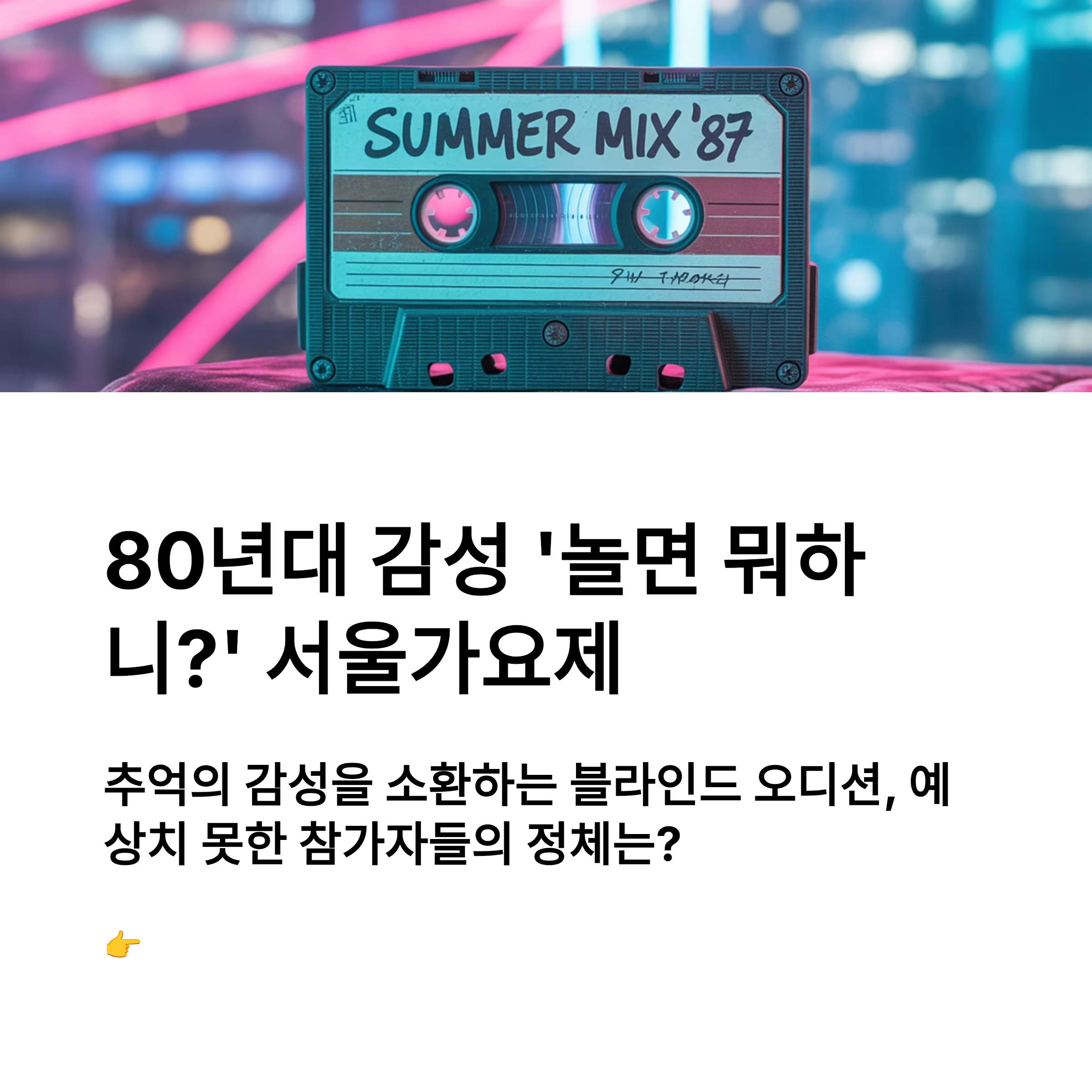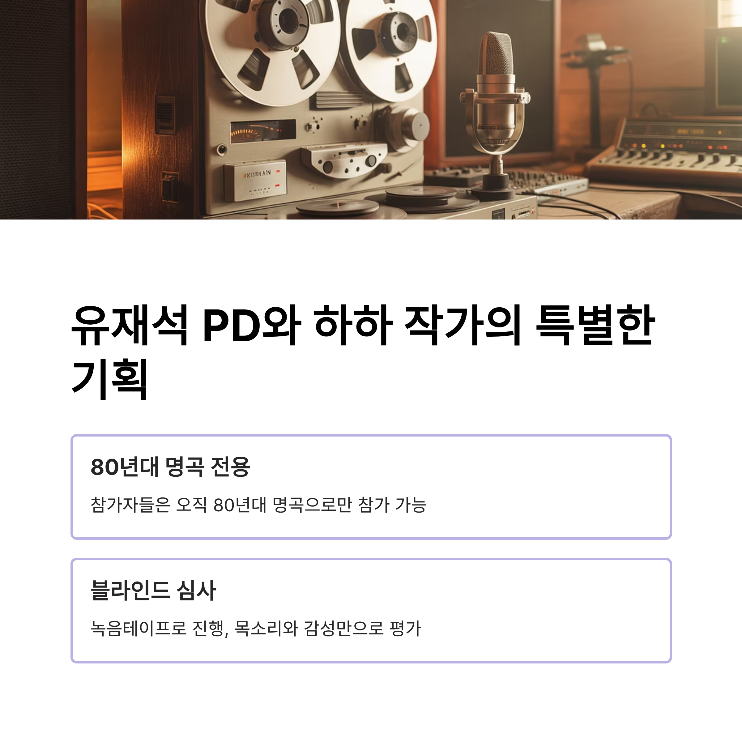 ‘놀면 뭐하니?’의 새로운 프로젝트인 ‘80s MBC 서울가요제’는 80년대 음악에 대한 깊은 애정과 추억을 가진 이들을 위한 특별한 오디션입니다. 유재석 PD와 하하 작가는 참가자들에게 오직 80년대 명곡으로만 참가할 것을 요청하며, 당시의 감성을 제대로 살릴 수 있는 목소리를 찾아 나섰는데요. 녹음테이프를 통해 진행된 블라인드 심사 방식은 참가자들의 정체를 숨긴 채 오직 목소리와 음악적 감성만으로 평가하는 공정한 기회를 제공했습니다.