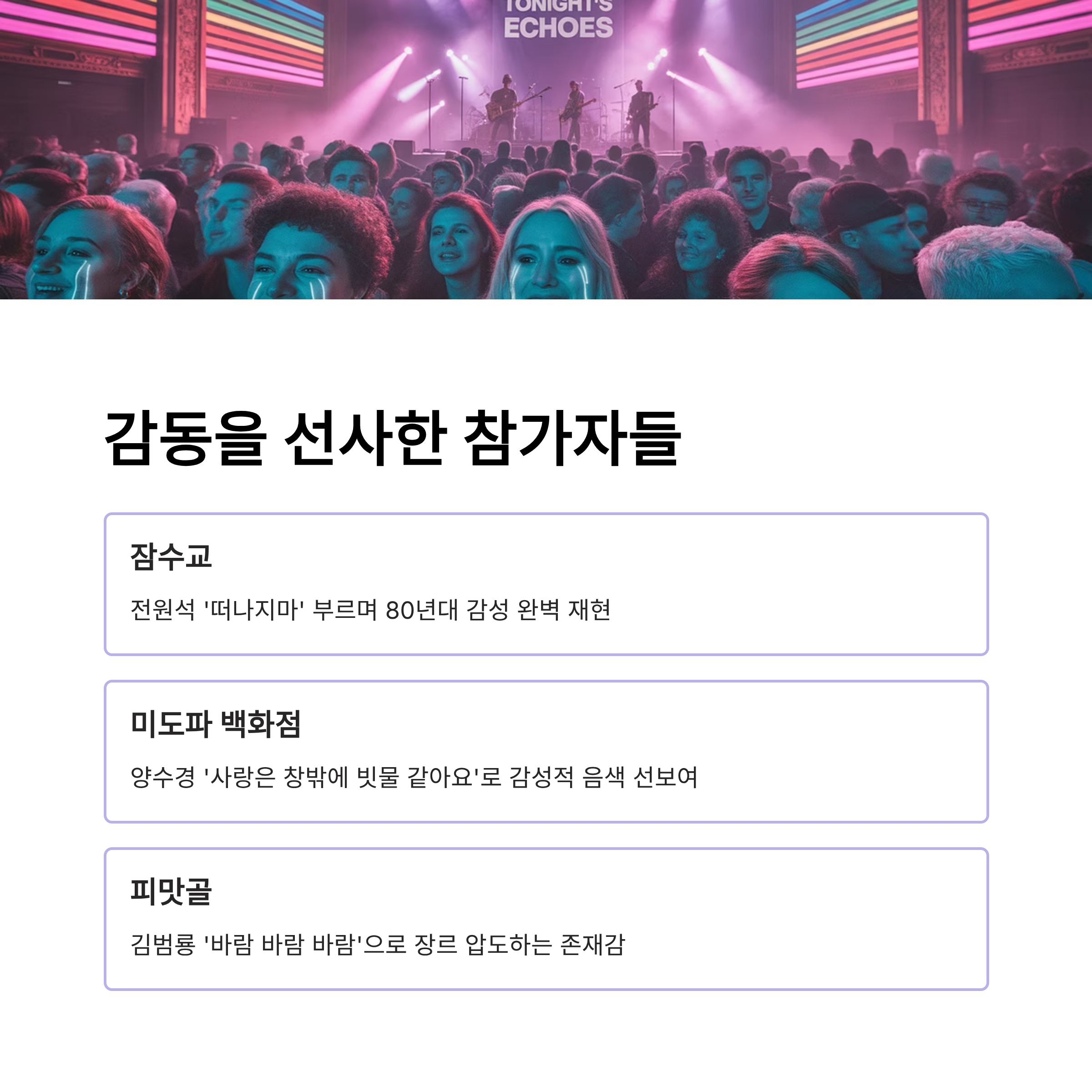 이번 ‘놀면 뭐하니?’ 서울가요제에는 정체를 숨기고 참가한 거물급 스타들이 많아 더욱 흥미로웠습니다. ‘잠수교’라는 닉네임으로 전원석의 ‘떠나지마’를 부른 참가자는 80년대 감성을 완벽하게 재현하며 유재석과 하하를 감탄하게 만들었습니다. 또한 양수경의 ‘사랑은 창밖에 빗물 같아요’를 부른 ‘미도파 백화점’은 촉촉하고 감성적인 음색으로 모두를 빠져들게 했으며, ‘피맛골’로 등장한 인물은 김범룡의 ‘바람 바람 바람’을 불러 목소리만으로도 장르를 압도하는 존재감을 드러냈습니다.