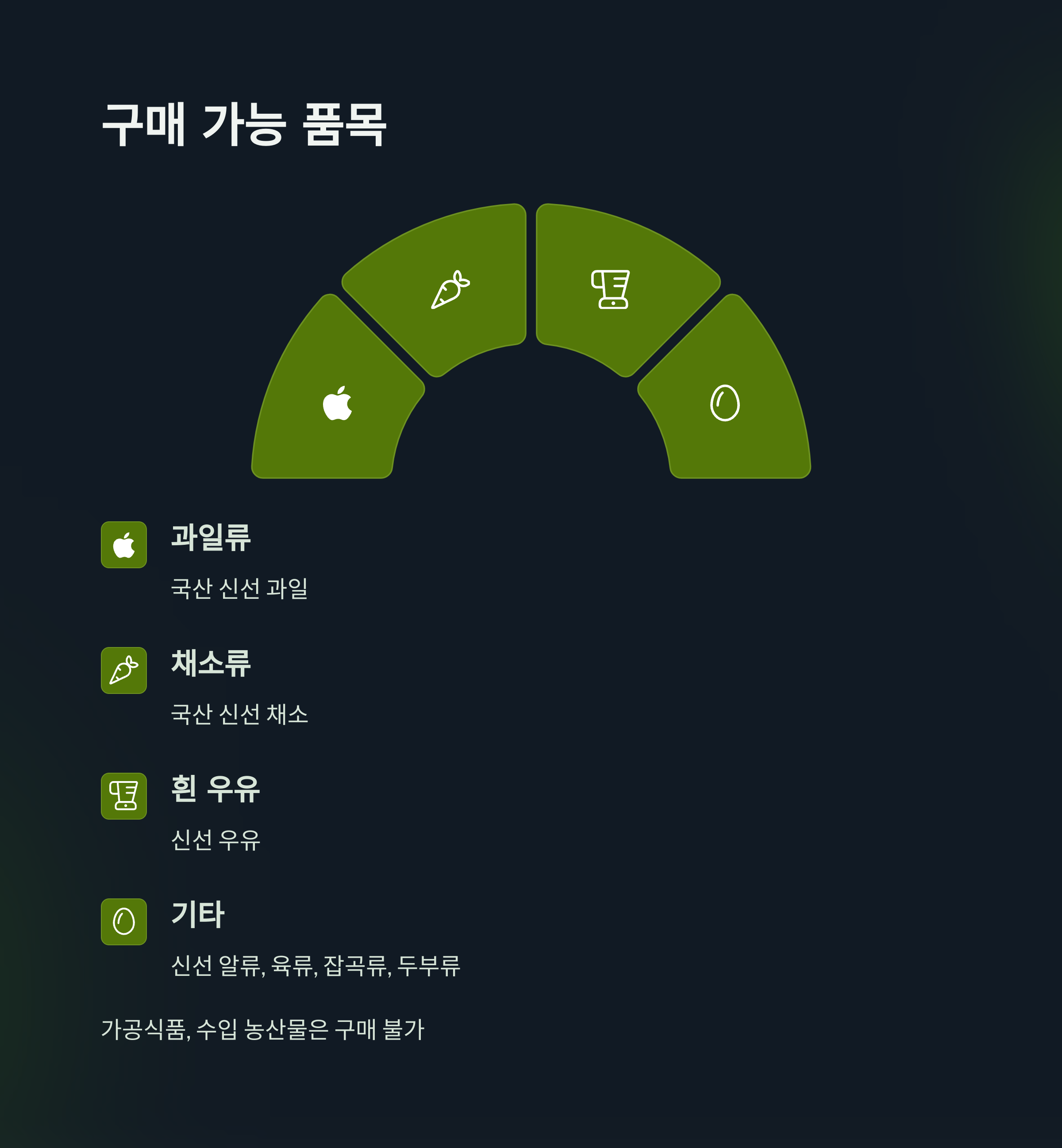 • 사용 가능 품목: 국산 과일류, 채소류, 흰 우유, 신선 알류, 육류, 잡곡류, 두부류 등 신선 농식품을 구매할 수 있습니다. 가공식품이나 수입 농산물 등은 구매할 수 없으니 유의하시기 바랍니다.