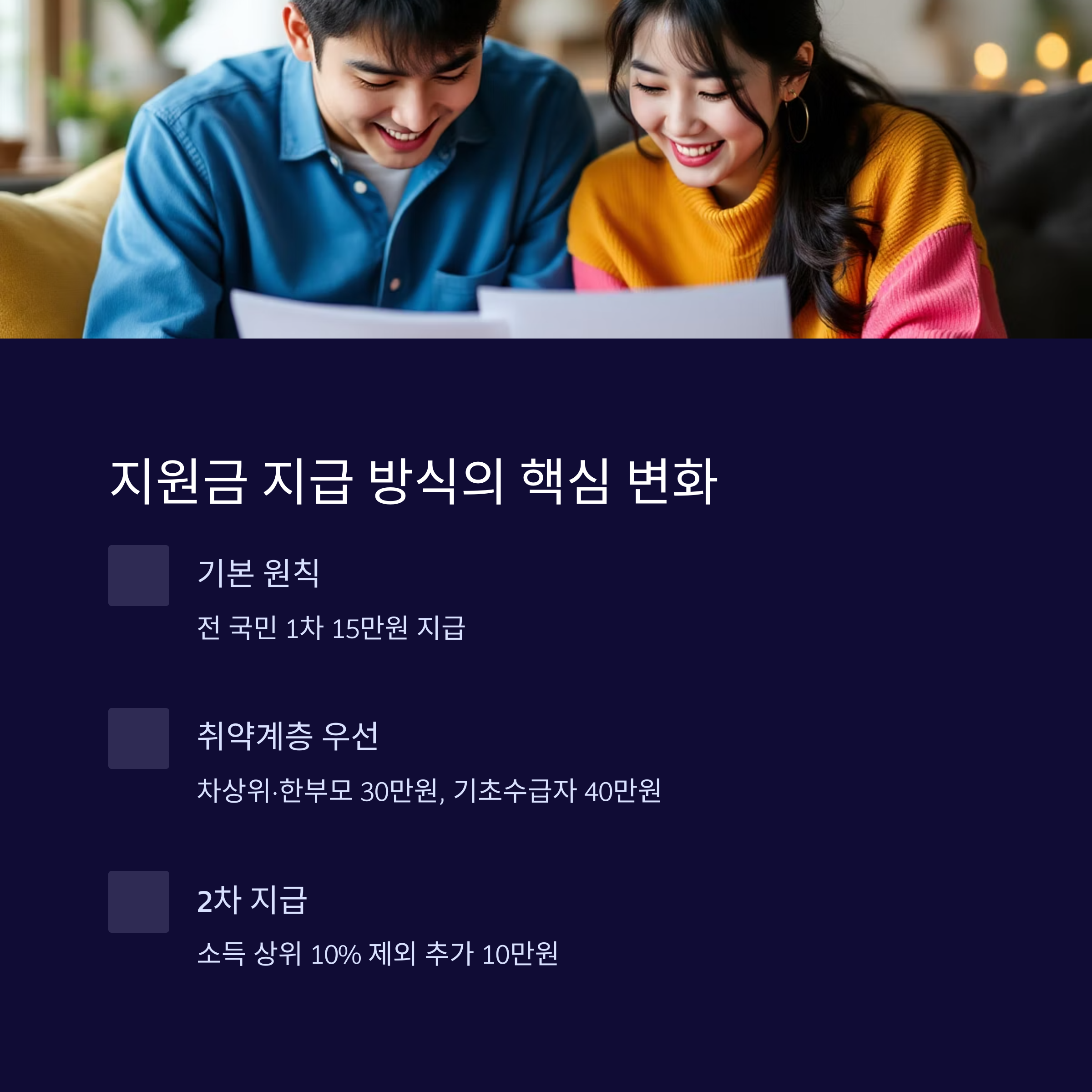 • 2차 지급: 건강보험료를 기준으로 소득 상위 10%를 제외한 국민에게 10만 원이 추가 지급됩니다. 이로써 일반 국민은 총 25만 원, 차상위계층·한부모가정은 40만 원, 기초생활수급자는 50만 원을 받게 됩니다.