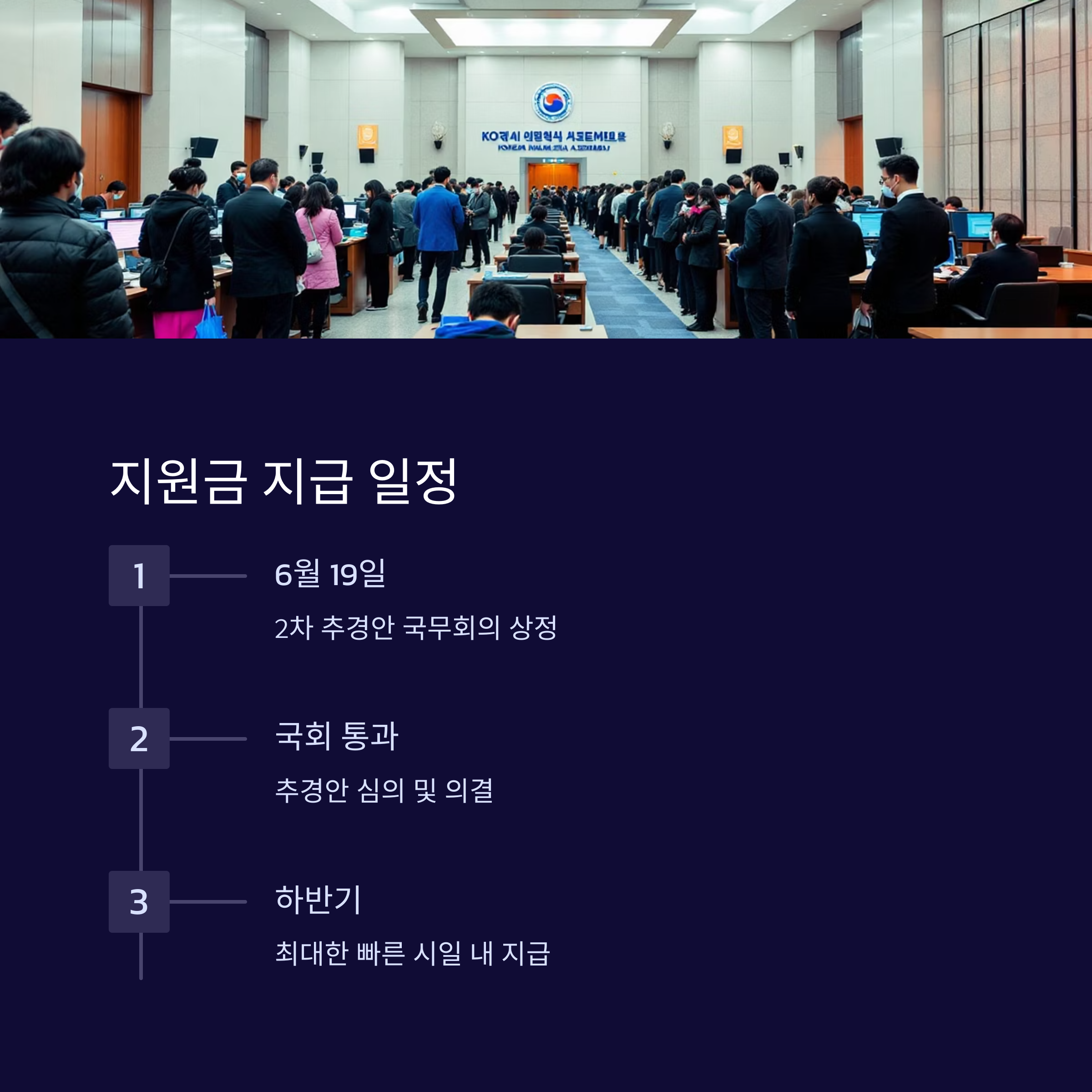 A. 2차 추가경정예산안이 6월 19일 국무회의에 상정된 후, 국회 통과와 예산 집행 절차를 거쳐 하반기 내 최대한 빠르게 지급될 예정입니다.