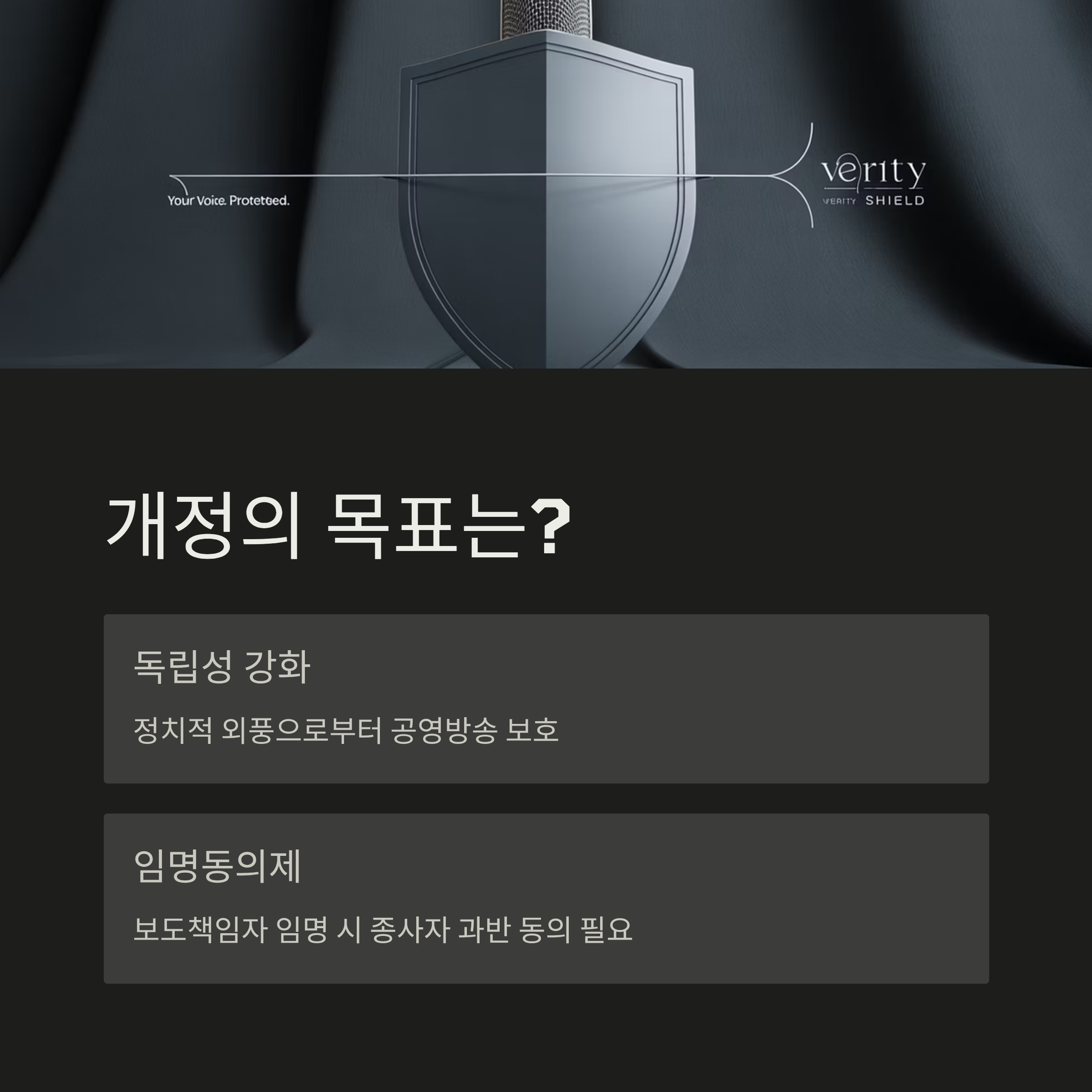 방송3법 개정의 궁극적인 목표는 공영방송의 독립성을 강화하고 정치적 외풍으로부터 자유롭게 만드는 것입니다. 법안을 추진하는 측에서는 현행 방식이 정권의 입맛에 맞는 인사를 앉혀 방송을 장악하는 수단이 되어왔다고 지적합니다. 따라서 이사회 구성원을 다양화하고, 사장 선임 절차에 '특별다수제'를 도입하여 어느 한쪽의 입김만으로는 사장을 임명할 수 없게 하겠다는 것이죠. 또한, 보도책임자를 임명할 때 보도 분야 종사자 과반의 동의를 얻도록 하는 '임명동의제'를 법률로 명시하여 보도의 독립성도 확보하겠다는 취지입니다.