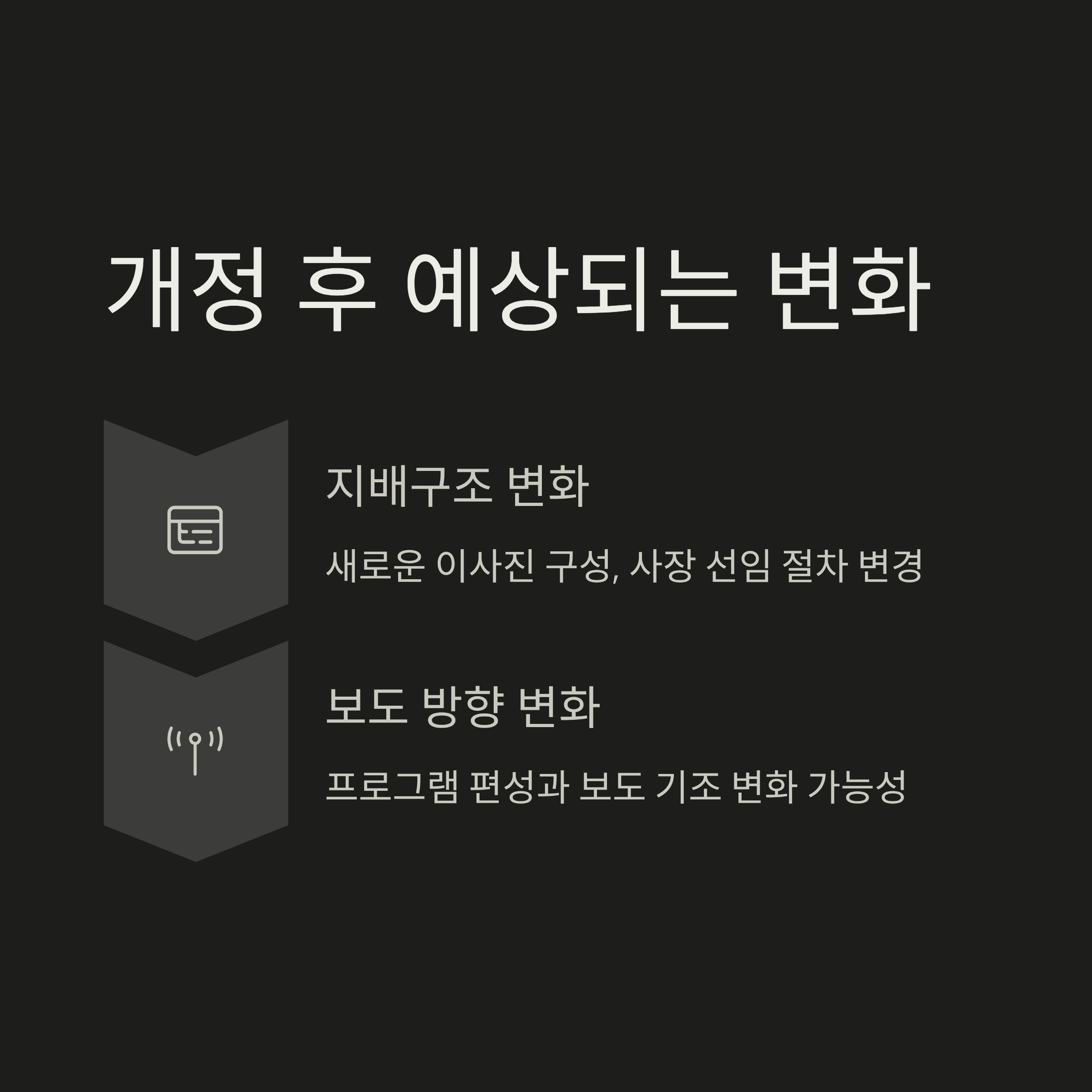만약 방송3법 개정안이 최종적으로 통과된다면, 가장 먼저 공영방송의 지배구조에 큰 변화가 일어날 것입니다. KBS, MBC, EBS의 이사진이 새롭게 꾸려지고, 사장 선임 절차 또한 새로운 규정에 따라 진행될 가능성이 높습니다. 이 과정에서 공영방송의 보도와 프로그램 편성 방향에도 크고 작은 변화가 예상됩니다.