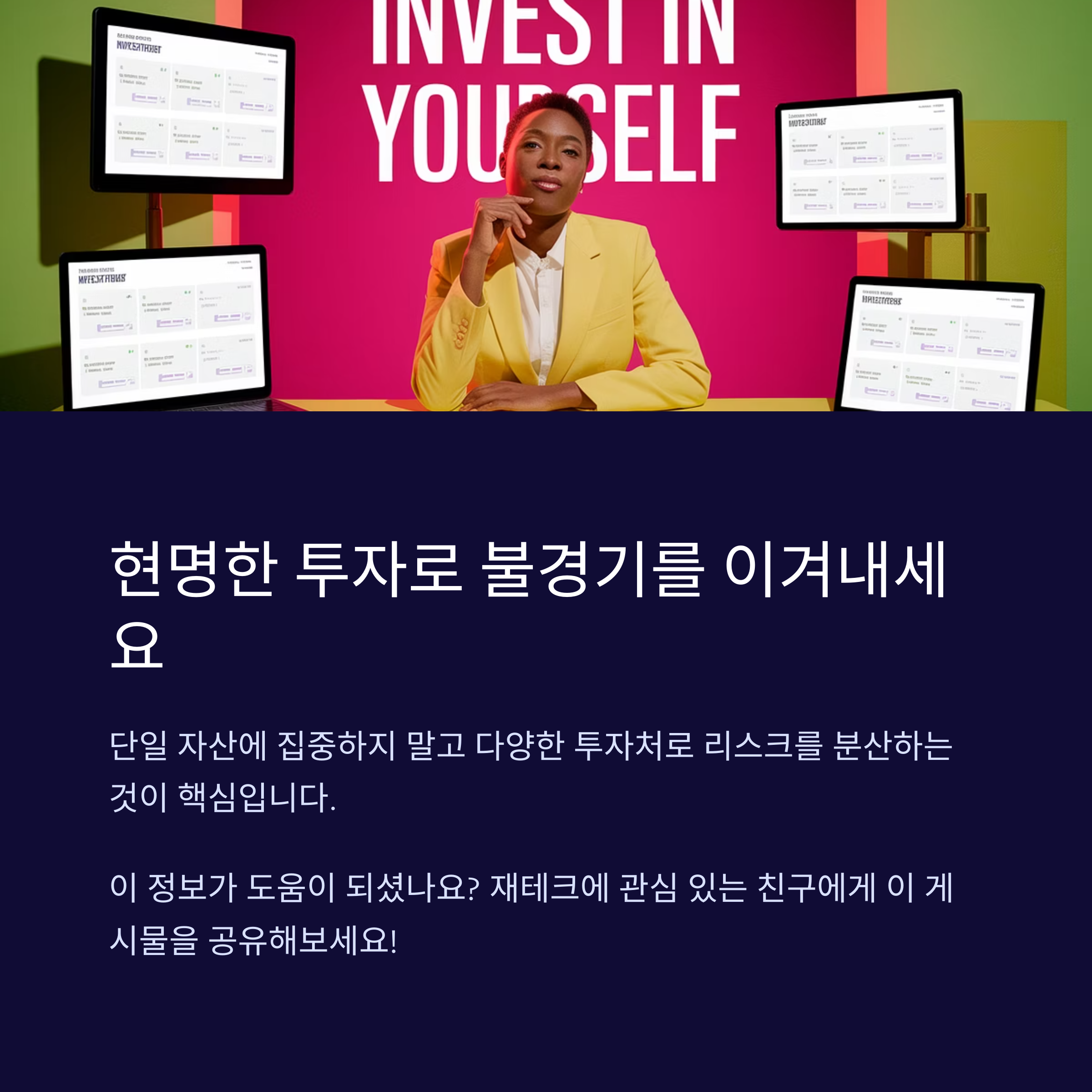 단일 자산에 집중하면 불경기 충격을 견디기 어렵습니다. **부동산 30% + 주식 30% + 안전자산 40%**처럼 비중을 나누고, 해외 비중을 20~30%로 유지하세요. 예를 들어 국내 리츠(REITs)로 부동산 수익을 노리는 동시에 글로벌 채권펀드로 안정성을 확보할 수 있습니다. 매월 일정 금액을 DCA(Dollar-Cost Averaging) 방식으로 투자하면 시장 타이밍을 잡는 부담도 줄어듭니다.
