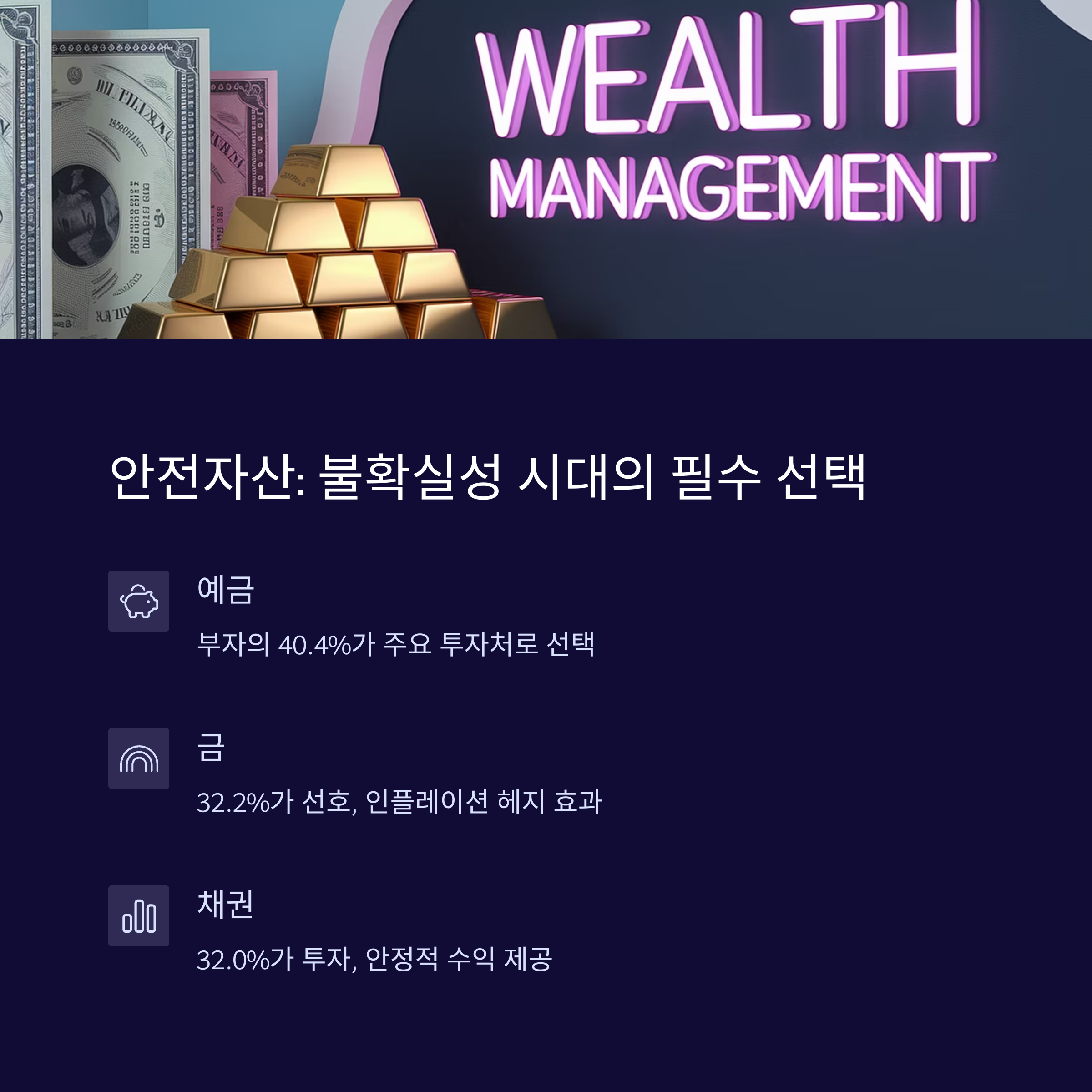 예금·채권·금은 변동성에 흔들리지 않는 대표적인 안전자산입니다. 2025년 조사에 따르면, 부자의 40.4%가 예금을 주요 투자처로 꼽았으며 금(32.2%)과 채권(32.0%)이 그 뒤를 이었습니다. 특히 금은 인플레이션 헤지 효과가 있어 화폐 가치 하락 시 실질 자산을 보존하는 데 유용합니다. 단기적으로는 CMA나 MMDA처럼 유동성이 높은 상품도 현금 흐름 관리에 도움이 되죠.