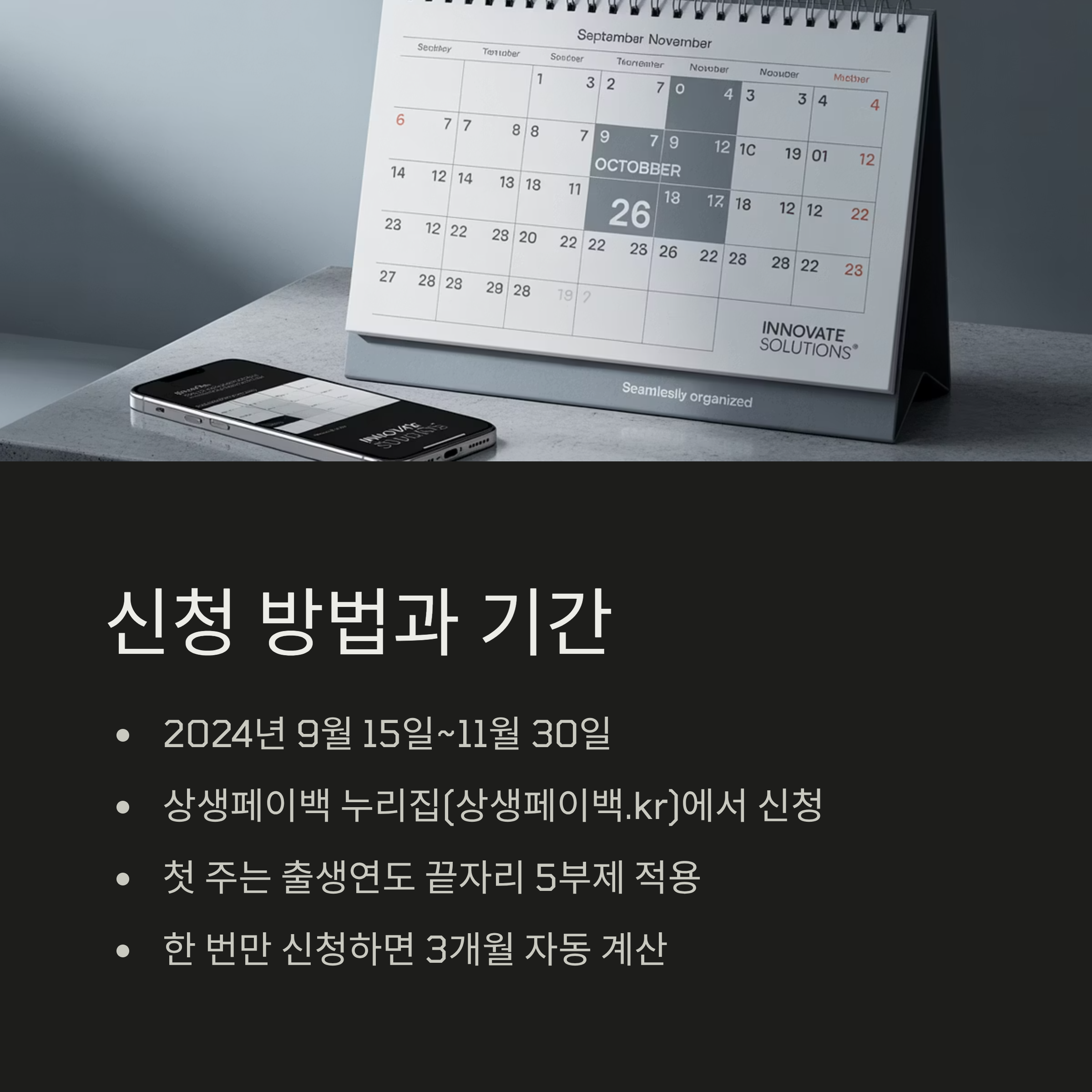 상생페이백 신청은 2024년 9월 15일 오전 9시부터 11월 30일 자정까지 '상생페이백 누리집(상생페이백.kr)'에서 온라인으로 신청할 수 있습니다. 첫 주에는 출생연도 끝자리에 따른 5부제가 적용되니, 서둘러 신청하고 싶다면 본인의 출생연도를 확인하고 신청 일정을 체크하는 것이 좋습니다.