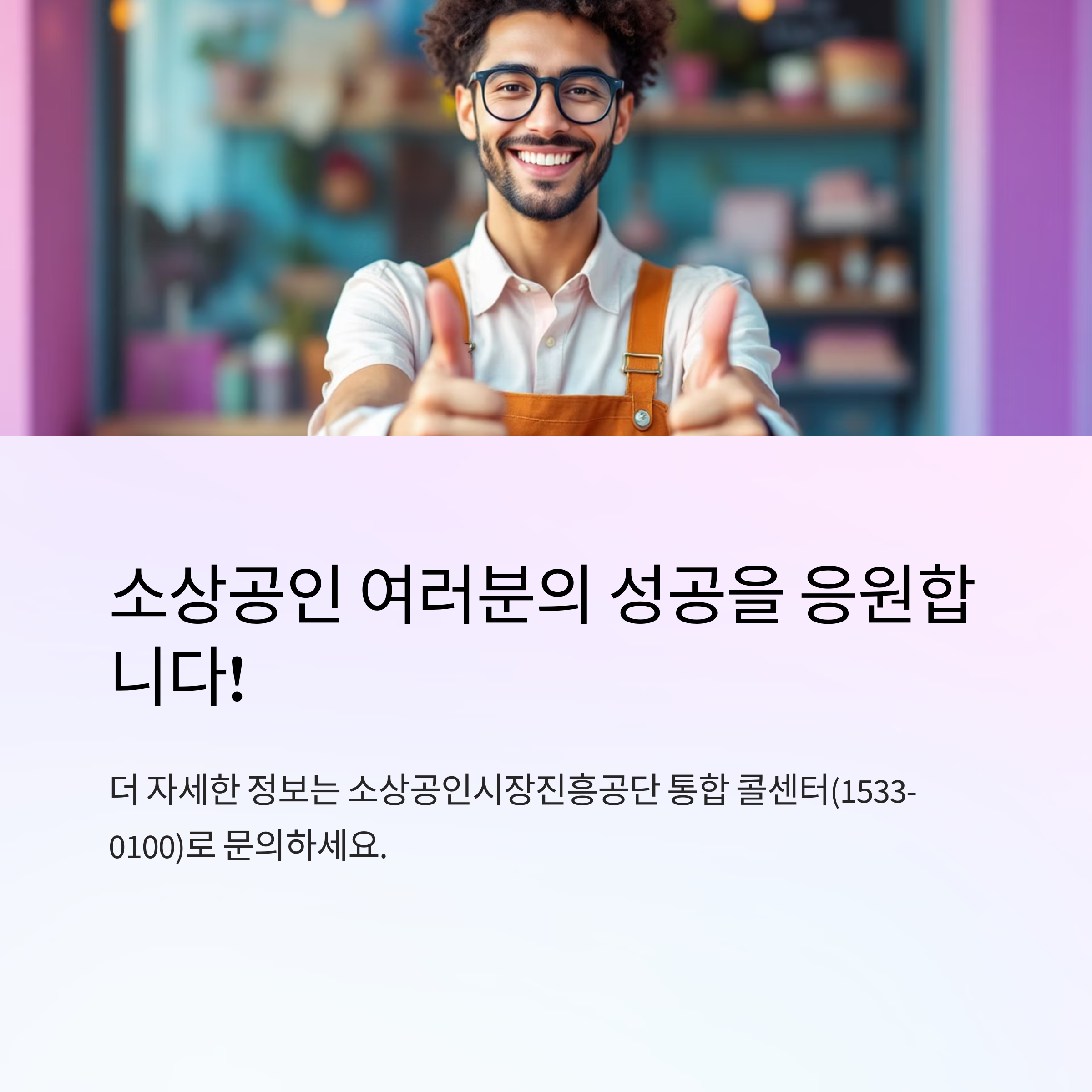 내 사업에 꼭 필요한 지원을 놓치지 않도록 꾸준히 정보를 찾아보고, 적극적으로 신청하여 사업을 더욱 튼튼하게 성장시키시길 응원합니다! 궁금한 점이 있다면 언제든지 소상공인시장진흥공단 통합 콜센터(1533-0100)나 기업마당 홈페이지(bizinfo.go.kr)를 통해 문의해 보세요. 여러분의 성공적인 사업을 기원합니다!