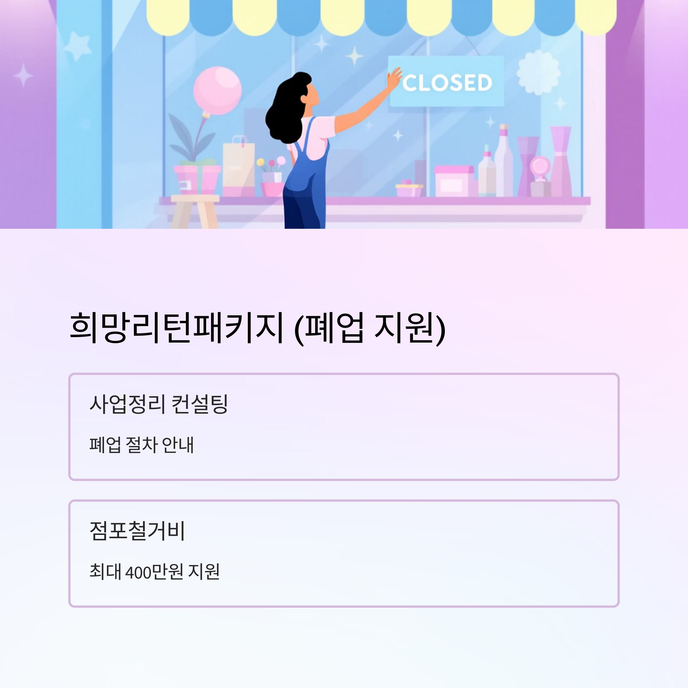 • 희망리턴패키지 (폐업 지원): 부득이하게 폐업하는 소상공인을 위한 지원 사업으로, 사업정리 컨설팅, 법률자문, 채무조정 신청 지원, 점포철거비 지원 등을 제공합니다. 특히 점포철거비는 전용면적 3.3㎡당 20만원 이내로 최대 400만원까지 지원받을 수 있으며, 2022년 1월 1일 이후 폐업한 소상공인도 신청 가능합니다.