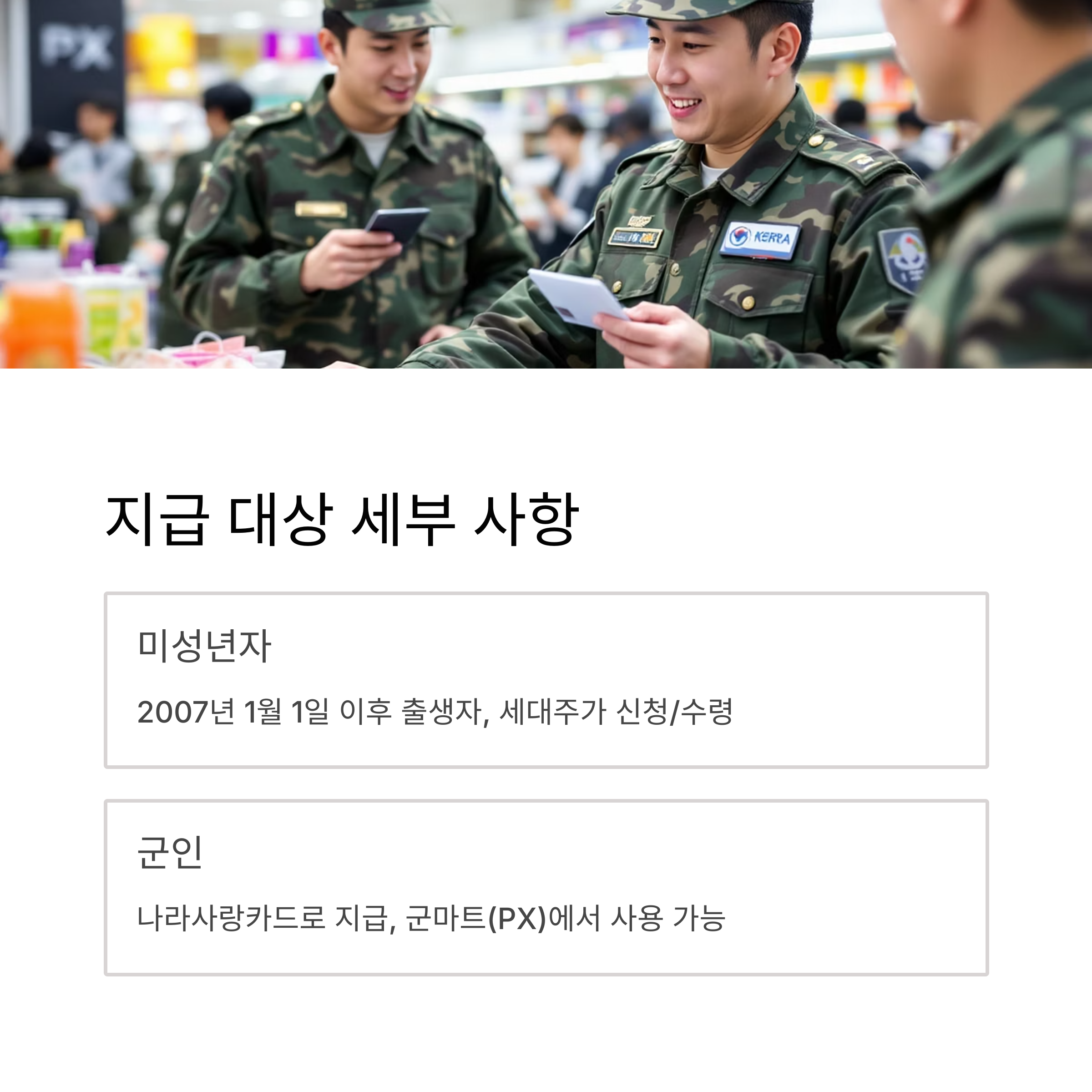 - 의무 복무 중인 군인: 나라사랑카드로 지급받는 경우에 한해 전국 군마트(PX)에서도 소비쿠폰 사용이 가능하도록 사용처를 넓혔습니다. 또한, 주소지 관할 시군구에 우편으로도 신청할 수 있는 등 편의를 제공합니다.