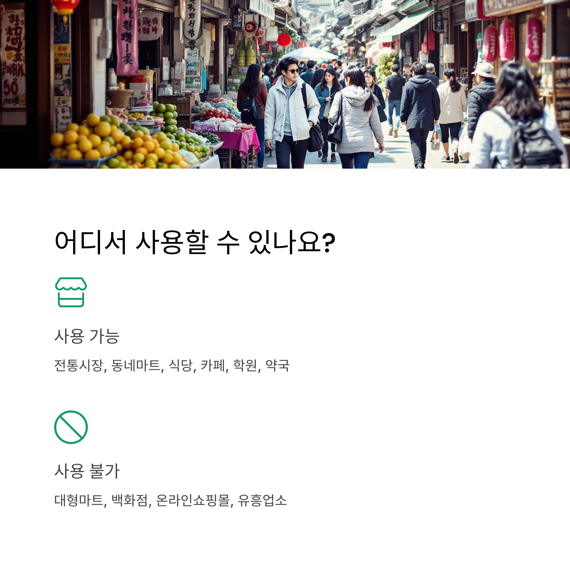 2025년 소비쿠폰은 지역 경제 활성화를 목표로 하고 있는 만큼, 사용처가 제한됩니다. 기본적으로는 신청자 본인의 주민등록상 주소지 관할 지역 내에서만 사용 가능하며, 연 매출액 30억 원 이하의 소상공인 매장에서 사용할 수 있습니다.