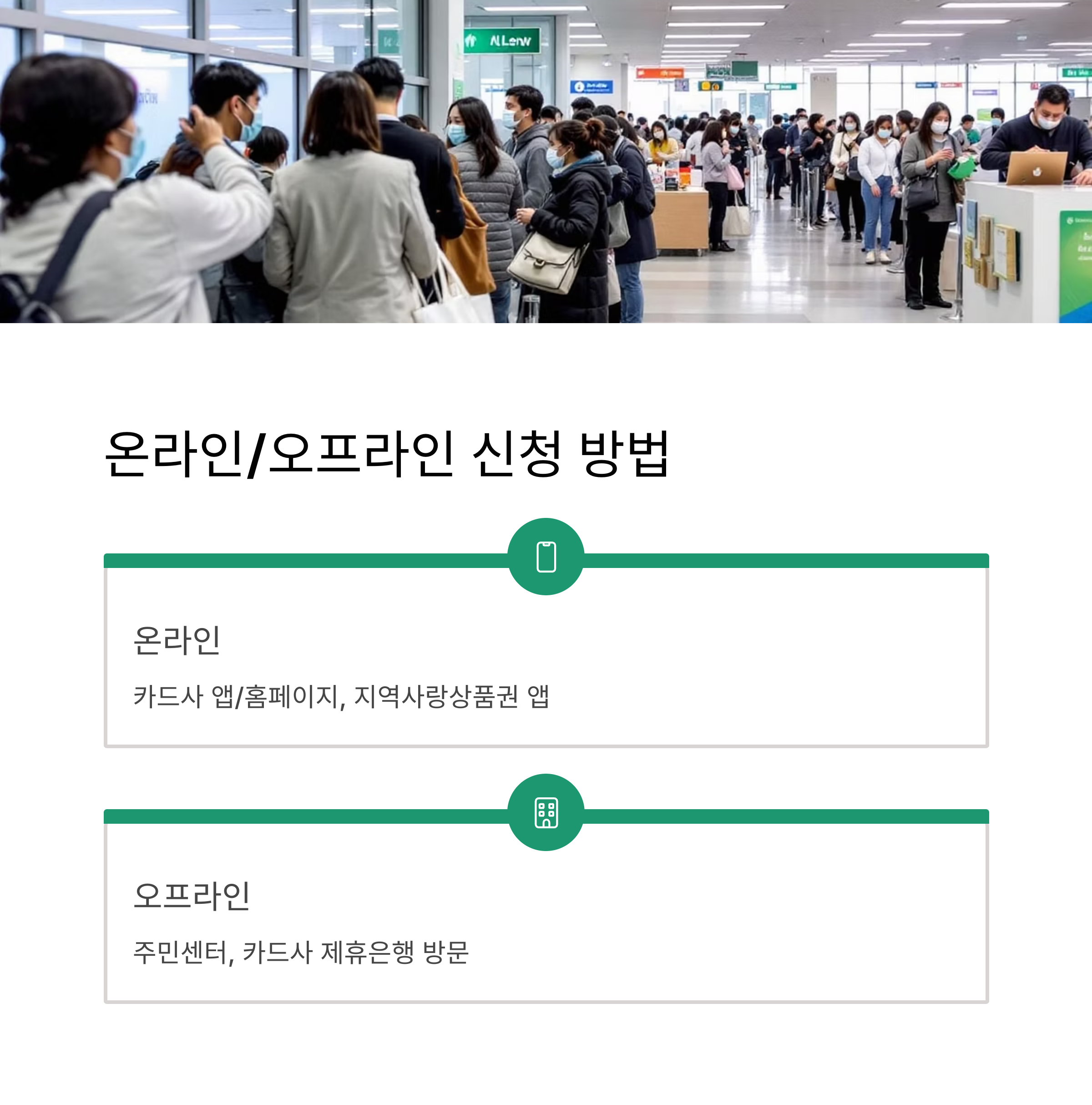 - 지역사랑상품권(모바일/카드형): 각 지역사랑상품권 앱을 통해 신청할 수 있습니다.