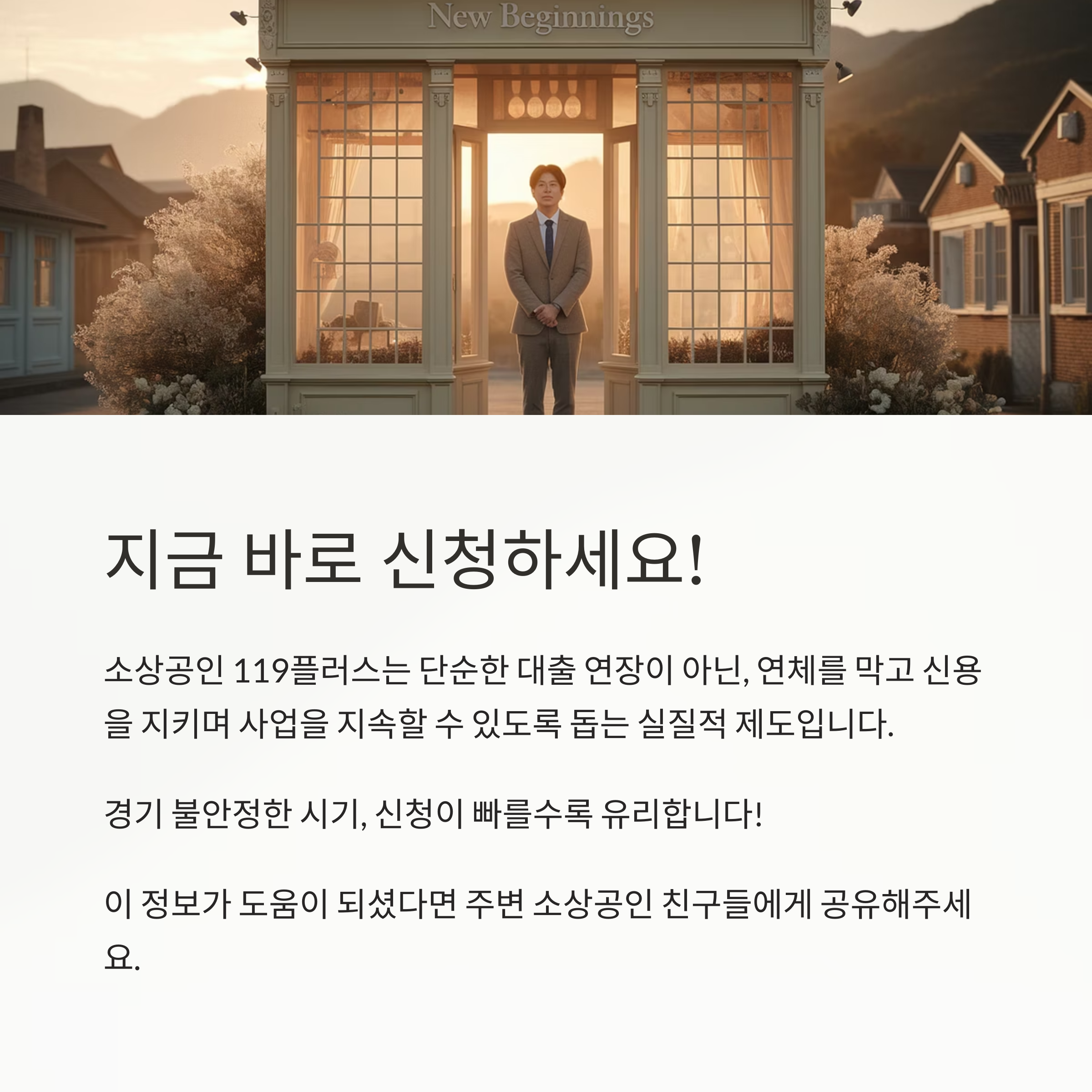 ‘소상공인 119플러스’의 핵심은 바로 **“시간과 이자 부담을 줄여주는 구조”**입니다.