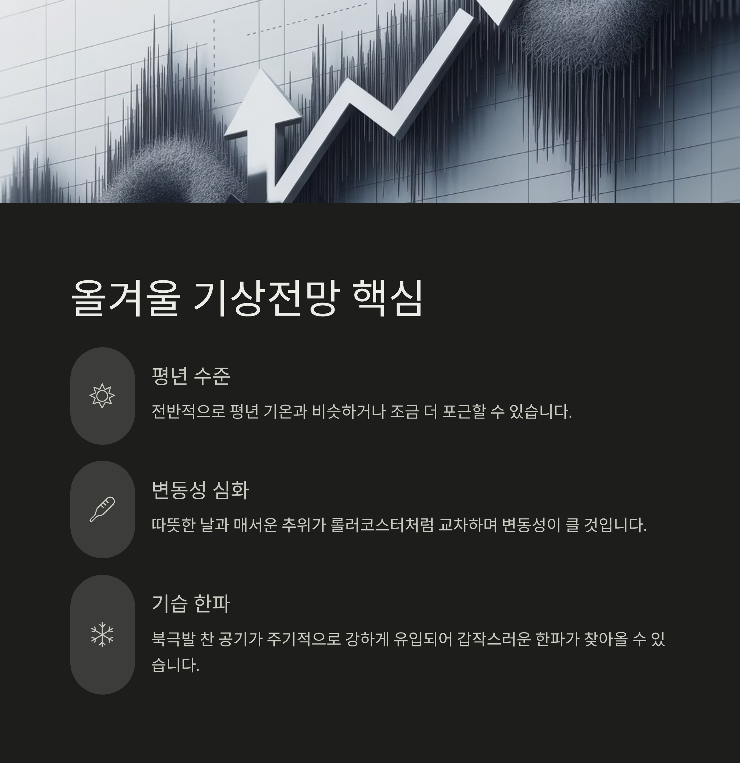 결론적으로, 올겨울 기상전망은 전체적으로 '덜 춥거나 비슷할 수 있지만', 예측하기 어려운 기온 변동성과 짧고 강렬한 한파에 대비해야 한다는 점이 가장 중요합니다.