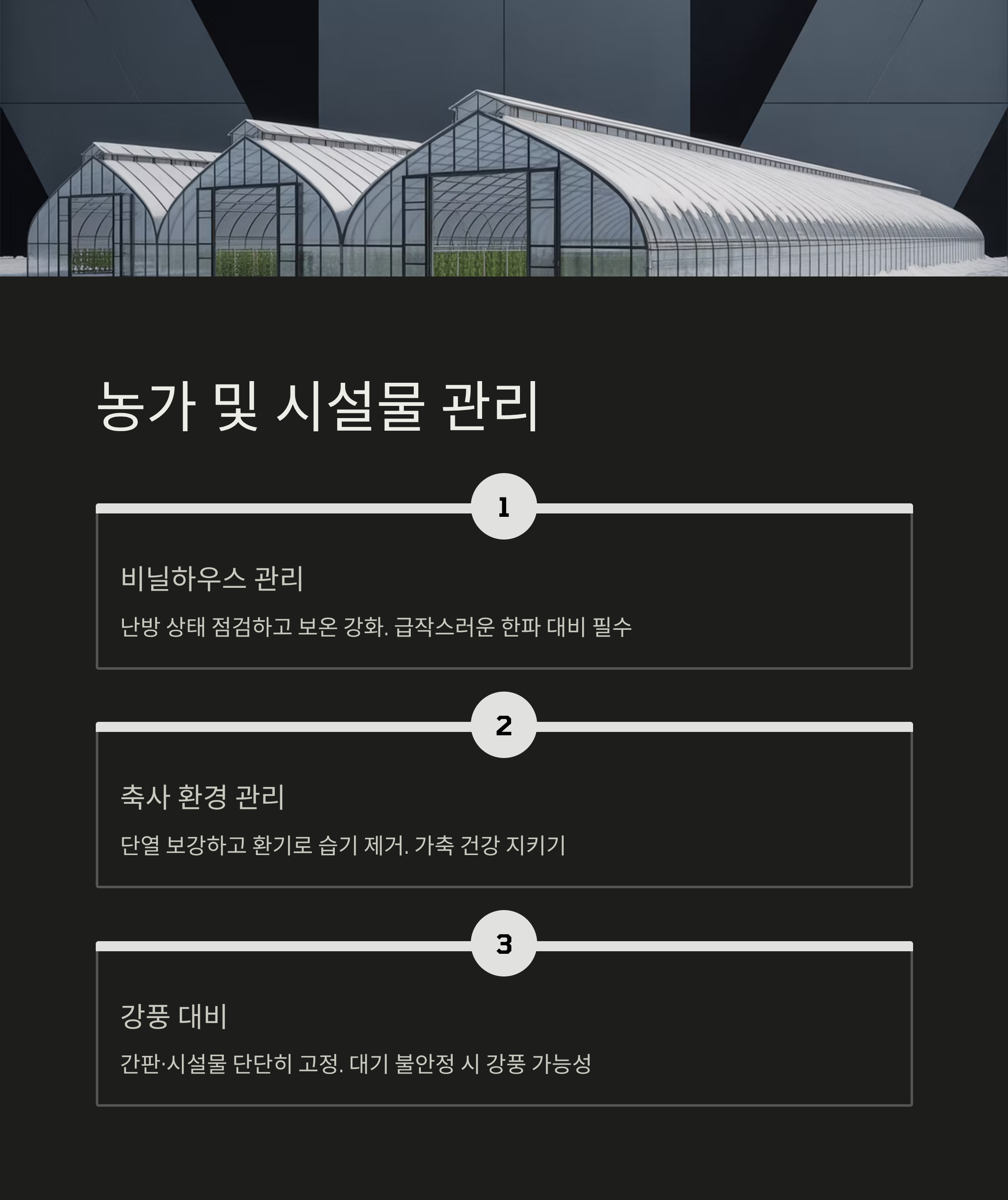 농작물 및 시설물 관리: 농가에서는 급작스러운 한파에 대비해 비닐하우스 등 시설물의 난방 상태를 점검하고 보온을 강화해야 합니다. 축사의 경우, 단열을 보강하고 환기를 통해 습기를 제거하여 가축의 건강을 지켜주세요.