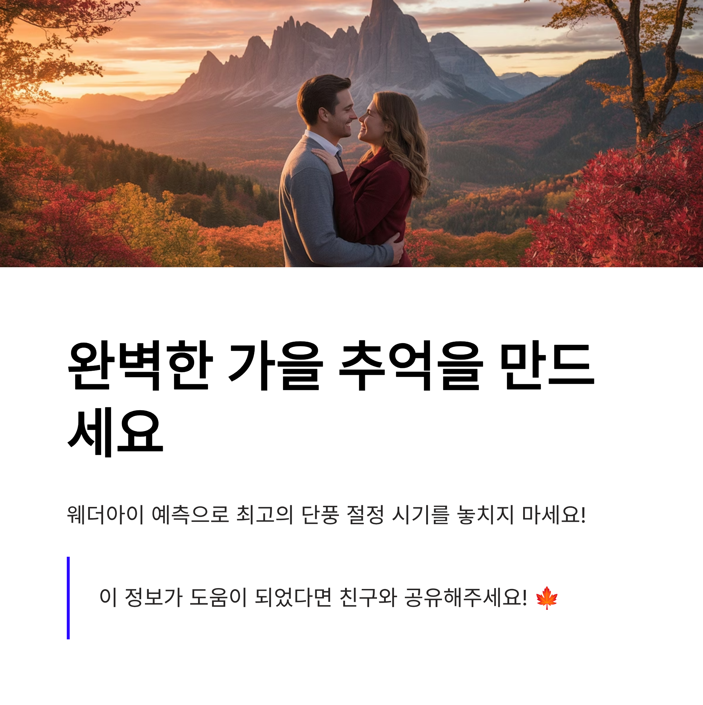 올해 2025년 단풍 절정 시기를 완벽하게 파악하셨나요? 웨더아이의 신뢰도 높은 예측 정보를 바탕으로, 여러분의 가을 여행이 후회 없는 최고의 순간으로 채워지기를 바랍니다. 북쪽의 설악산부터 남쪽의 내장산까지, 전국을 붉고 노랗게 물들일 아름다운 단풍을 찾아 떠나는 설레는 여정을 지금 바로 계획해 보세요!
