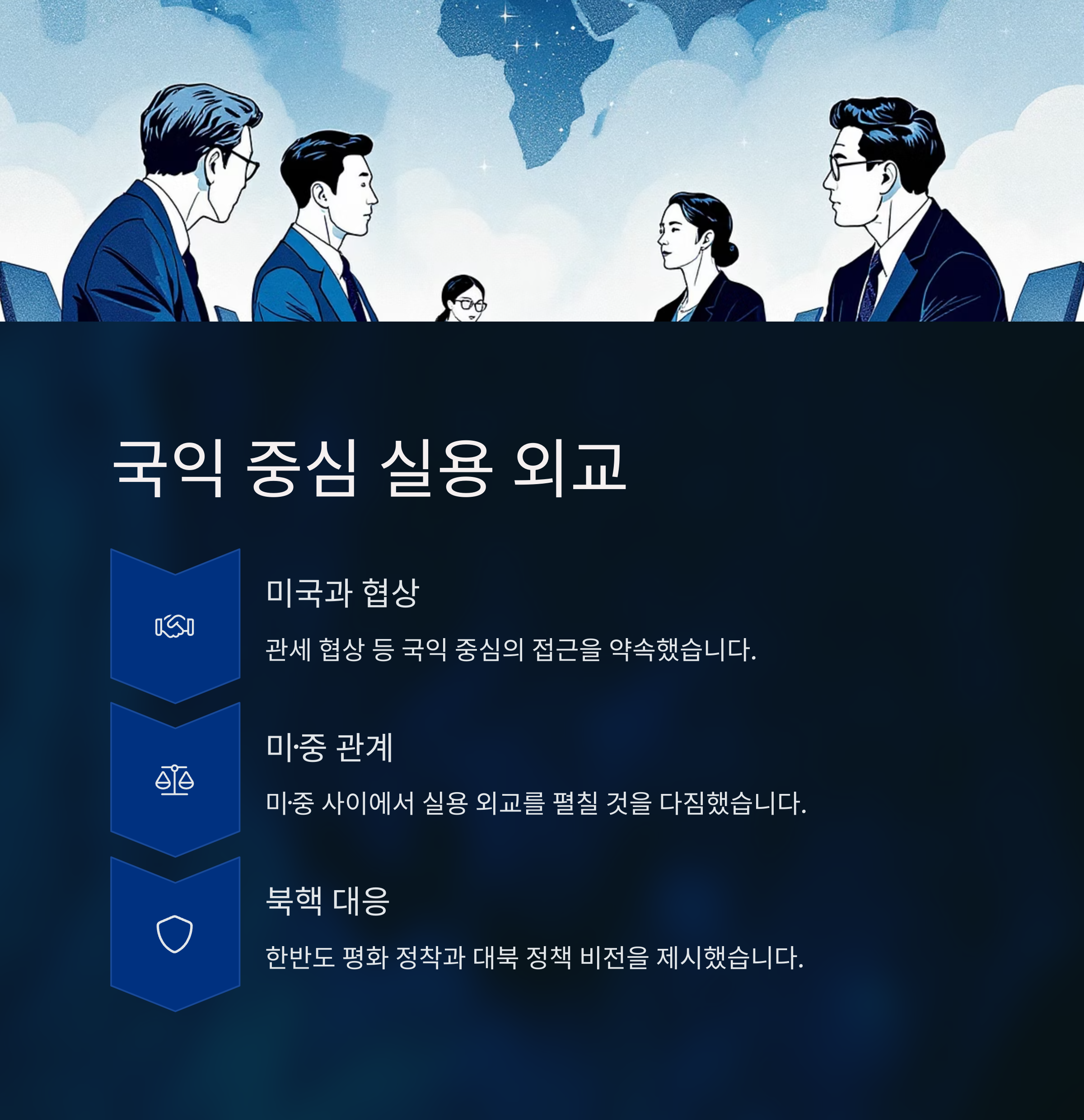 미국과의 관세 협상, 미·중 사이에서의 실용 외교, 북핵 대응 등 외교 안보 현안에 대해 국익 중심의 실용적 접근을 약속했습니다. 한반도 평화 정착과 대북 정책, 국제 정세 속 대한민국의 역할에 대한 비전도 제시되었습니다.