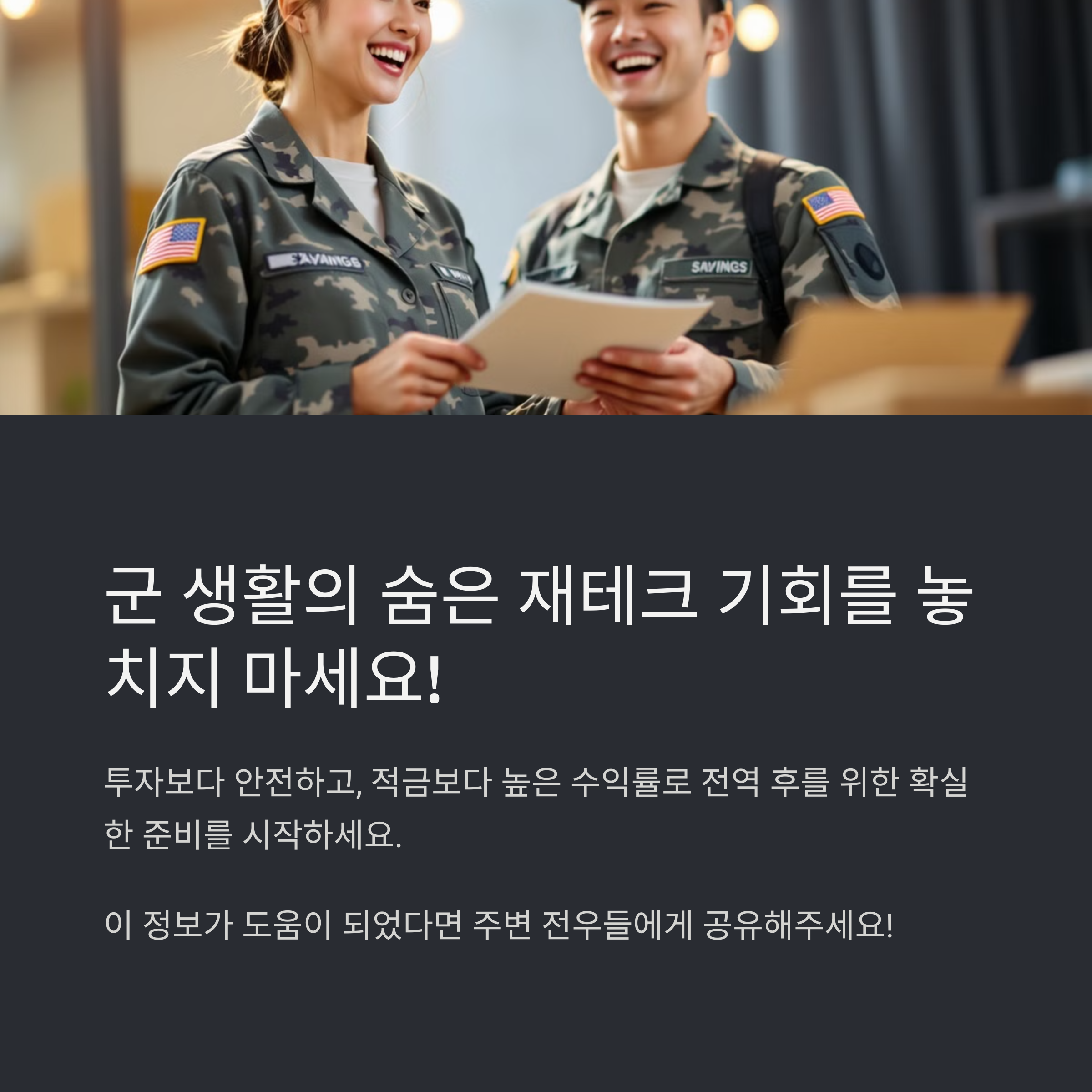 장병내일준비적금은 군 복무 기간을 재정적으로 스마트하게 관리할 수 있는 최고의 도구입니다. 2025년 상향된 납입 한도와 비대면 서비스를 적극 활용해 전역 후를 위한 확실한 준비를 시작해보세요. 투자보다 안전하고, 적금보다 높은 수익률로 군생활의 숨은 기회를 놓치지 마십시오!