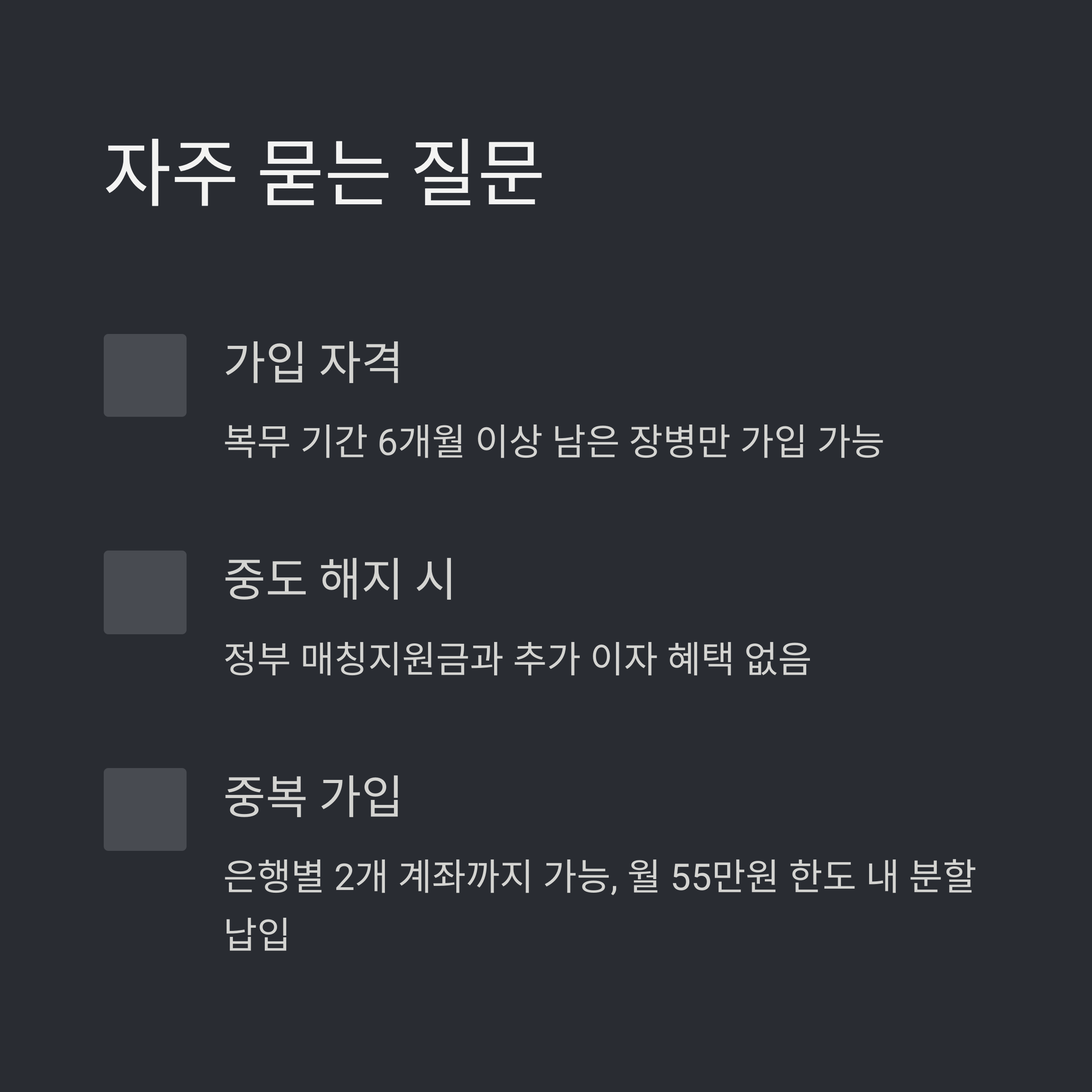 - 현역병, 상근예비역, 사회복무요원 등 복무 형태별로 6개월 이상 남은 장병 누구나 가입 가능.