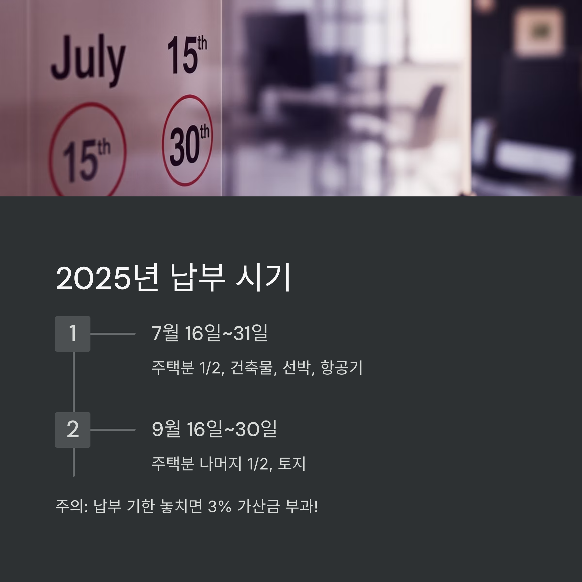 • 7월 16일 ~ 7월 31일: 주택분 재산세의 1/2, 주택 외 건축물, 선박, 항공기