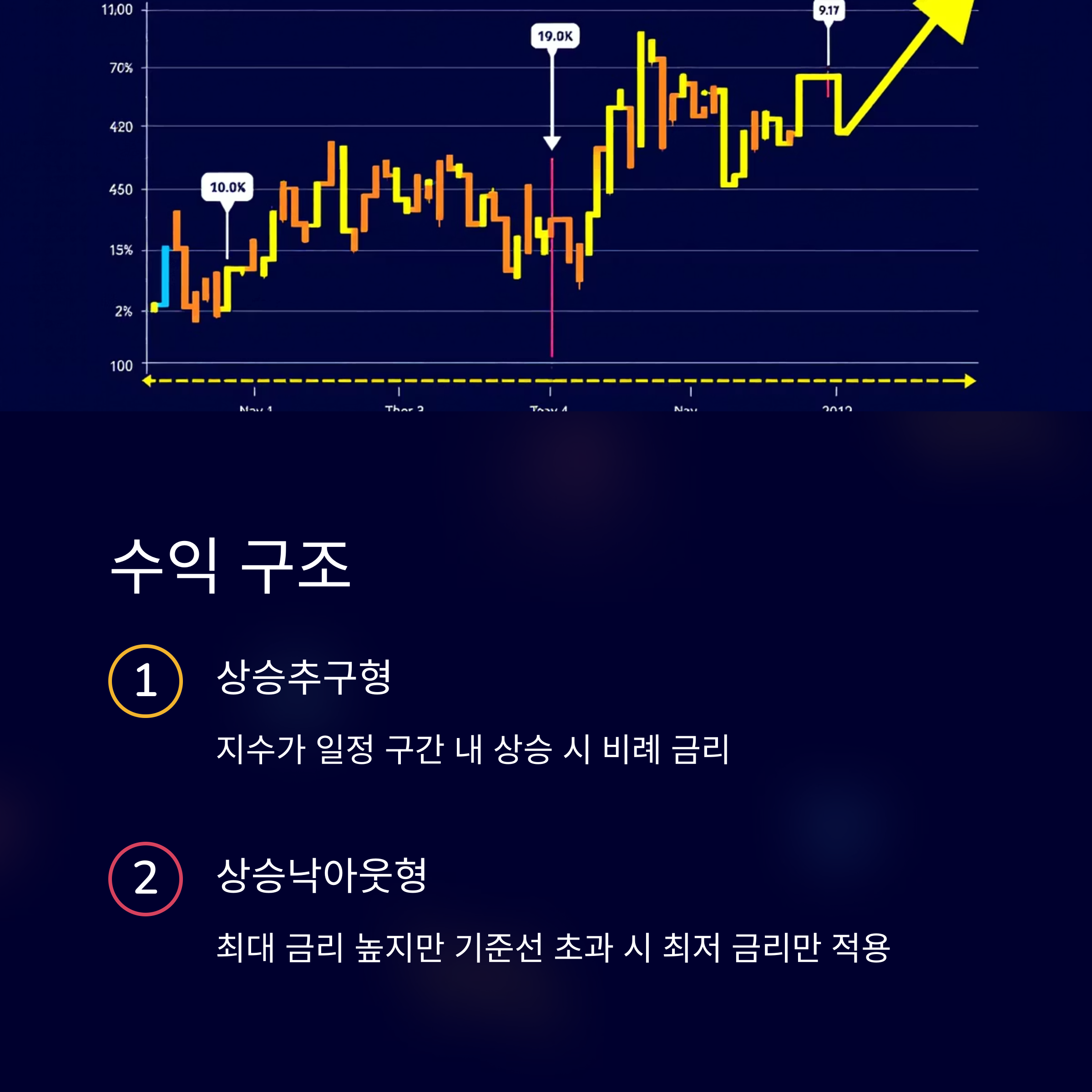 - 상승추구형: 주가지수가 일정 구간 내에서 상승하면 그에 비례해 금리가 결정되며, 구간을 초과하면 최대 금리가 적용됩니다.