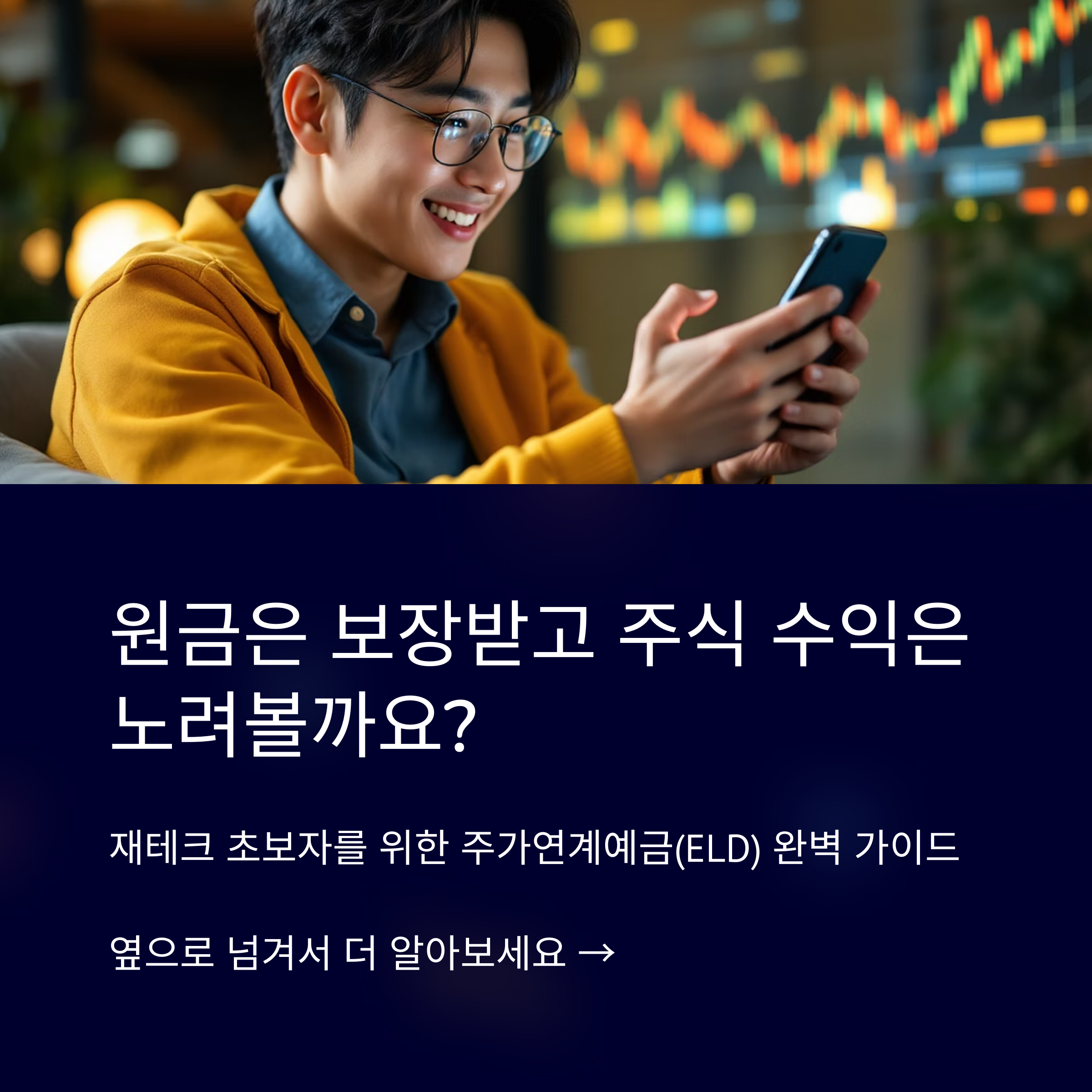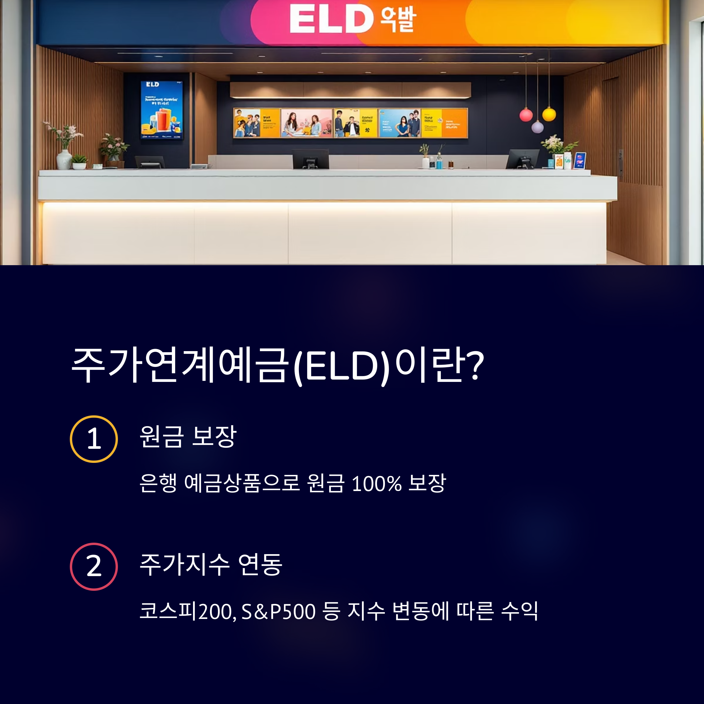 주가연계예금(ELD, Equity Linked Deposit)은 은행에서 판매하는 예금 상품으로, 예치한 원금은 안전하게 보장받으면서도 주가지수(예: 코스피200, S&P500 등)의 변동에 따라 추가 수익을 기대할 수 있습니다.