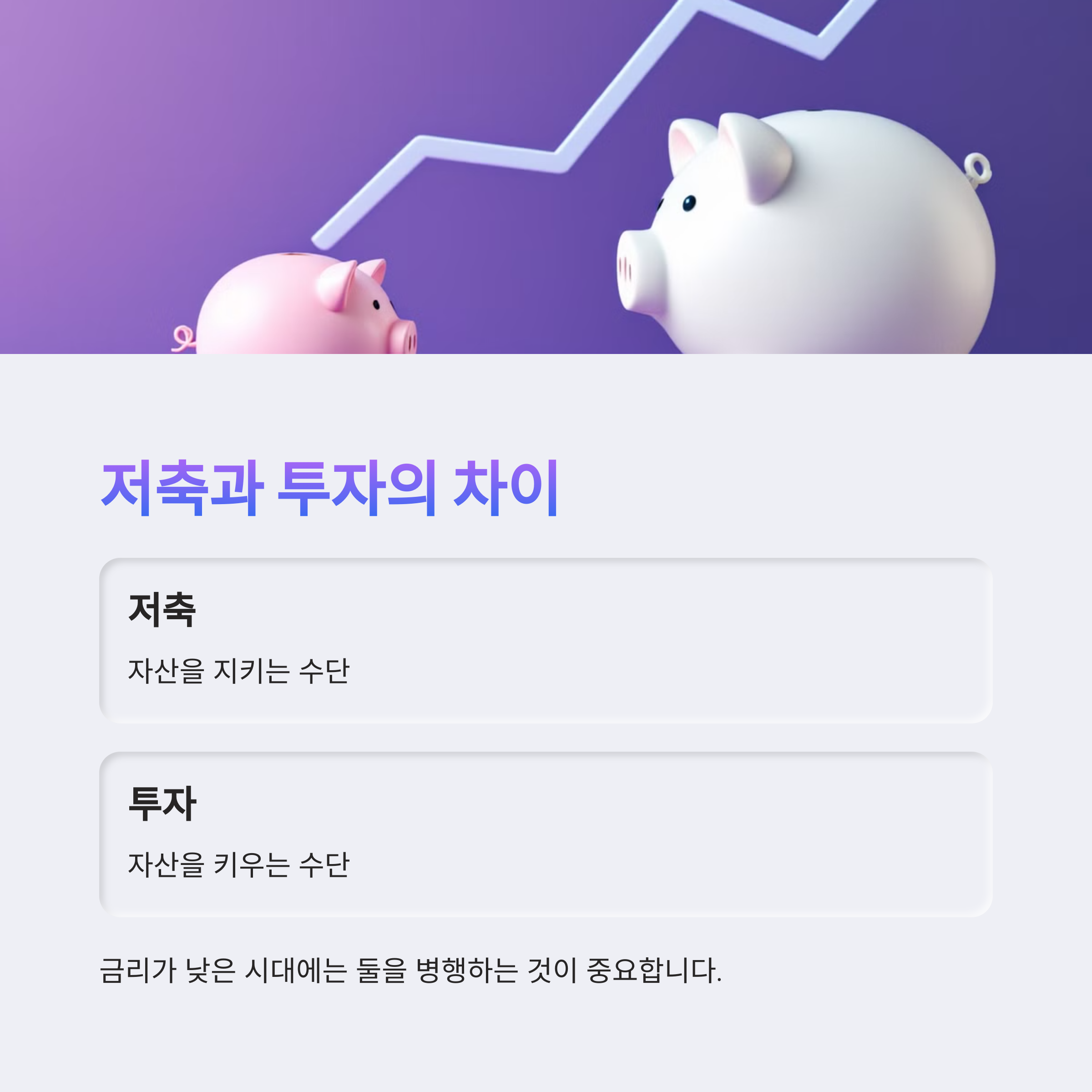많은 사람들이 ‘돈 모으기=저축’이라고 생각해요. 물론 저축은 가장 기초적인 재테크 방법이죠. 하지만 요즘처럼 금리가 낮은 시대에는 단순히 예금만으로는 자산이 불어나기 힘들어요. 저축은 자산을 지키는 수단이고, 투자는 자산을 키우는 수단이에요. 둘은 목적이 다르기 때문에 함께 병행하는 게 중요하죠.