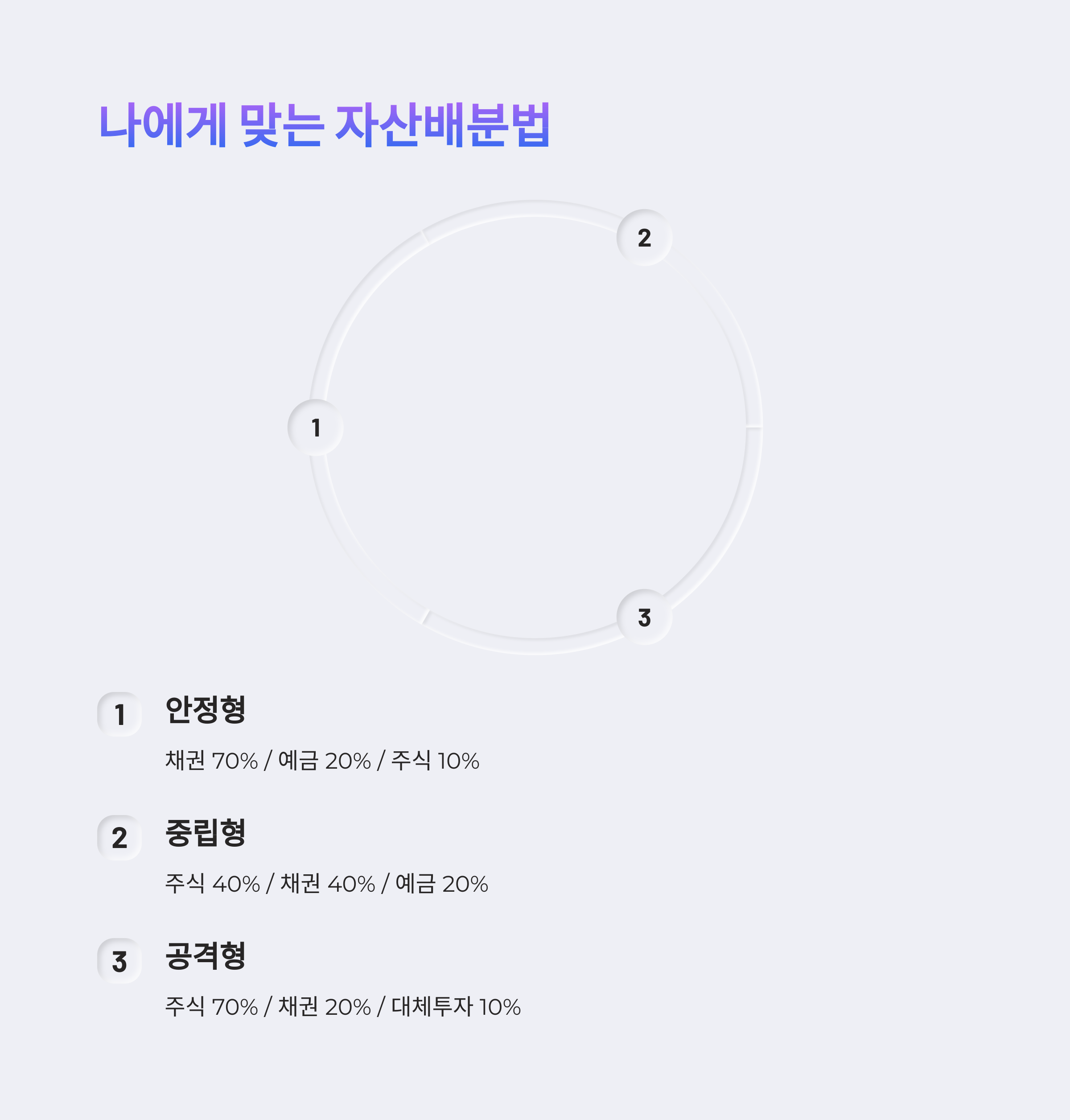 | 안정형 | 채권 70% / 예금 20% / 주식 10% |