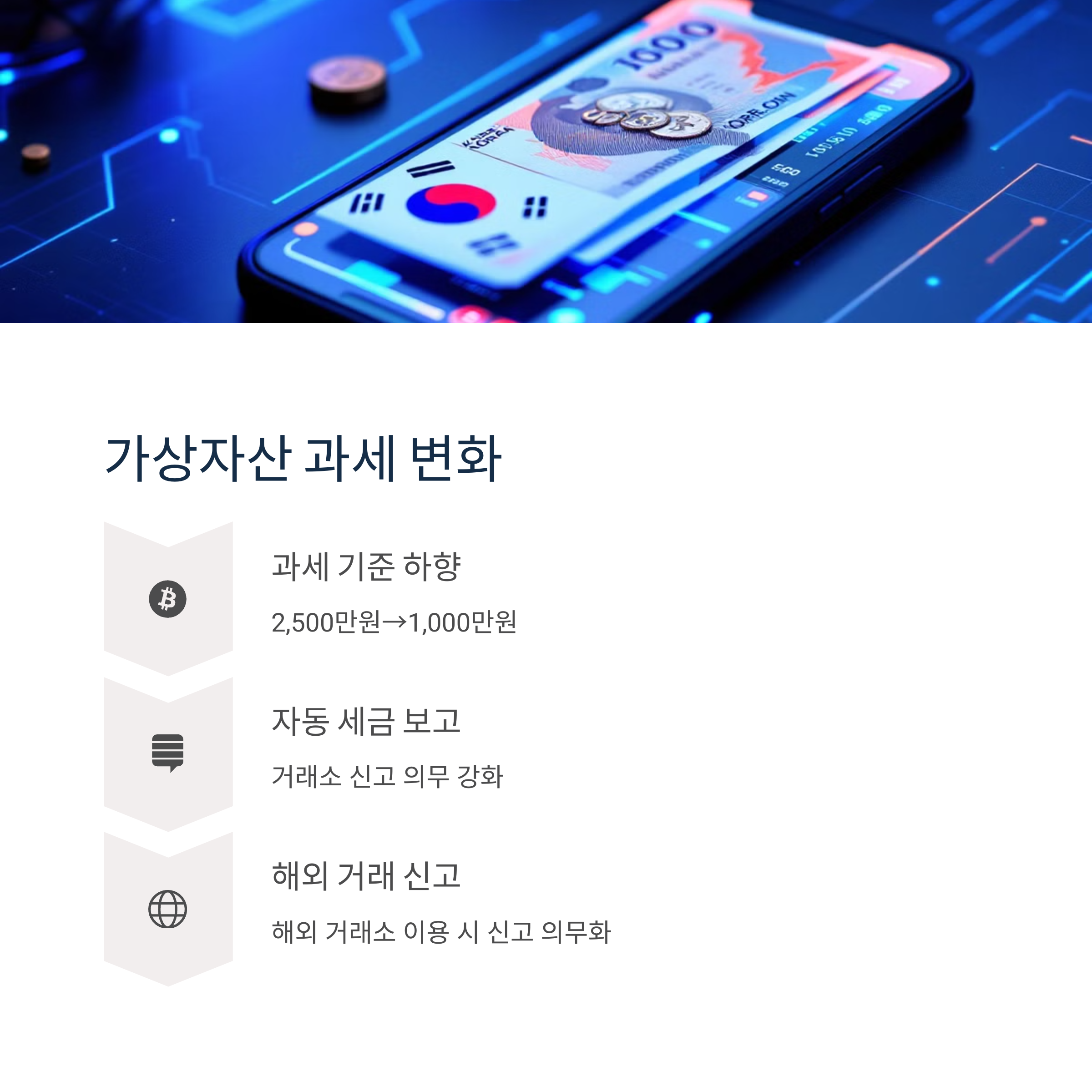 과세 기준 금액이 기존 2,500만 원에서 1,000만 원으로 하향 조정되었으며, 거래소의 자동 세금 보고 시스템이 도입되었습니다.