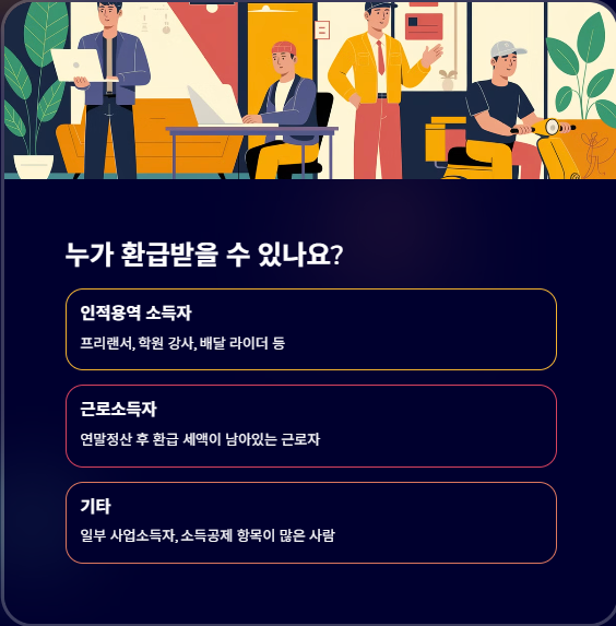 | 인적용역 소득자 | 프리랜서, 학원 강사, 방문 판매원, 배달 라이더 등 |