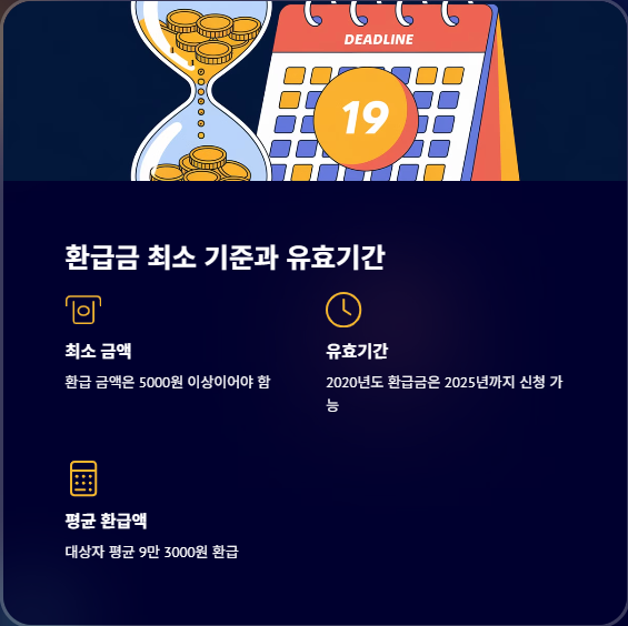 환급 금액은 5000원 이상이어야 하며, 2020년도 환급금은 2025년까지 신청하지 않으면 소멸되니 주의하세요.