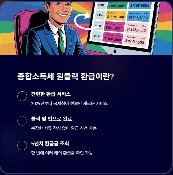 2025년부터 국세청이 새롭게 선보인 종합소득세 원클릭 환급 서비스는, 납세자가 홈택스에 접속해 단 몇 번의 클릭만으로 세금 환급을 신청할 수 있도록 지원하는 제도입니다.