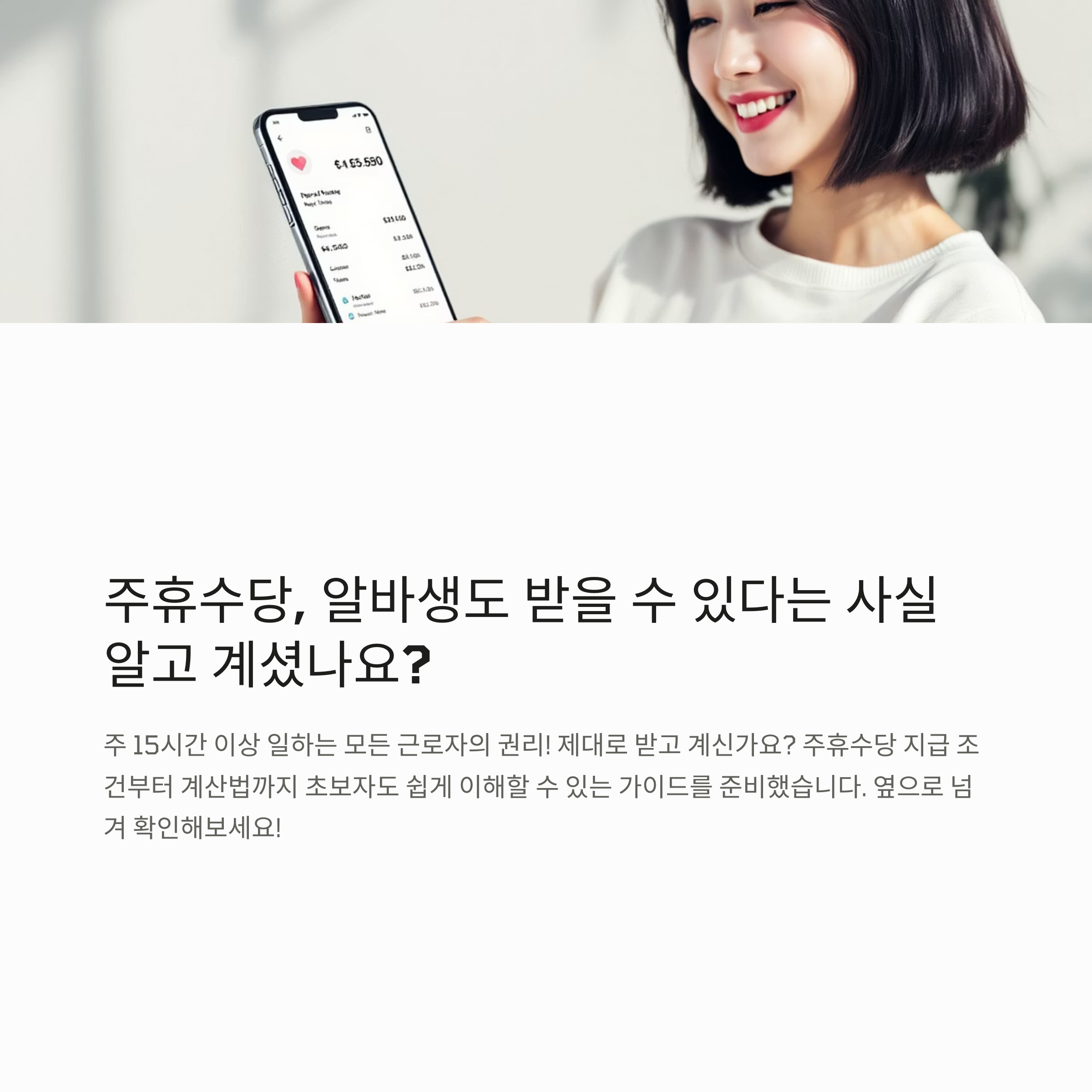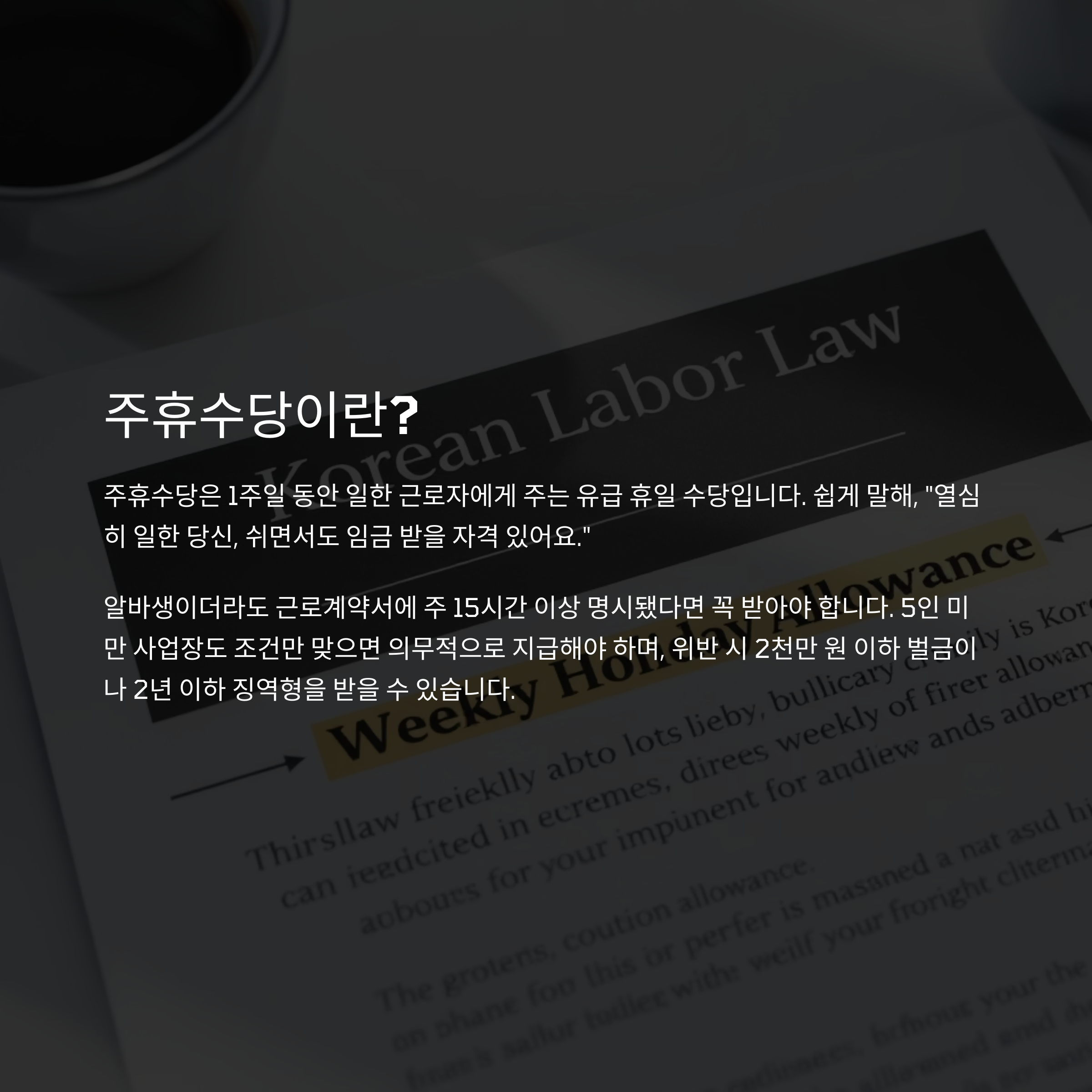 주휴수당은 1주일 동안 일한 근로자에게 주는 유급 휴일 수당입니다. 쉽게 말해, "열심히 일한 당신, 쉬면서도 임금 받을 자격 있어요. 알바생이더라도 근로계약서에 주 15시간 이상 명시됐다면 꼭 받아야 해요.