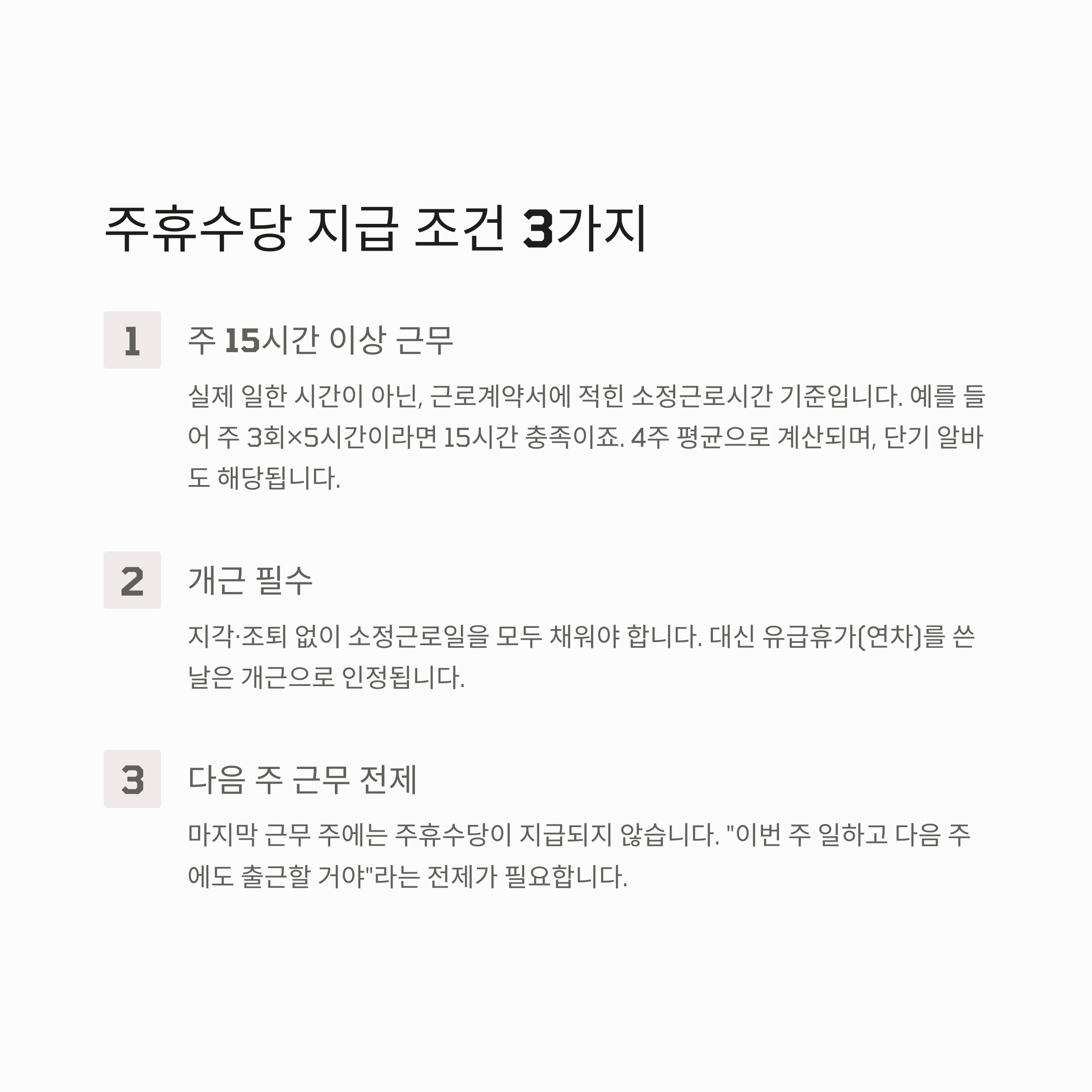 마지막 근무 주에는 주휴수당이 지급되지 않습니다. "이번 주 일하고 다음 주에도 출근할 거야"라는 전제가 필요하죠.