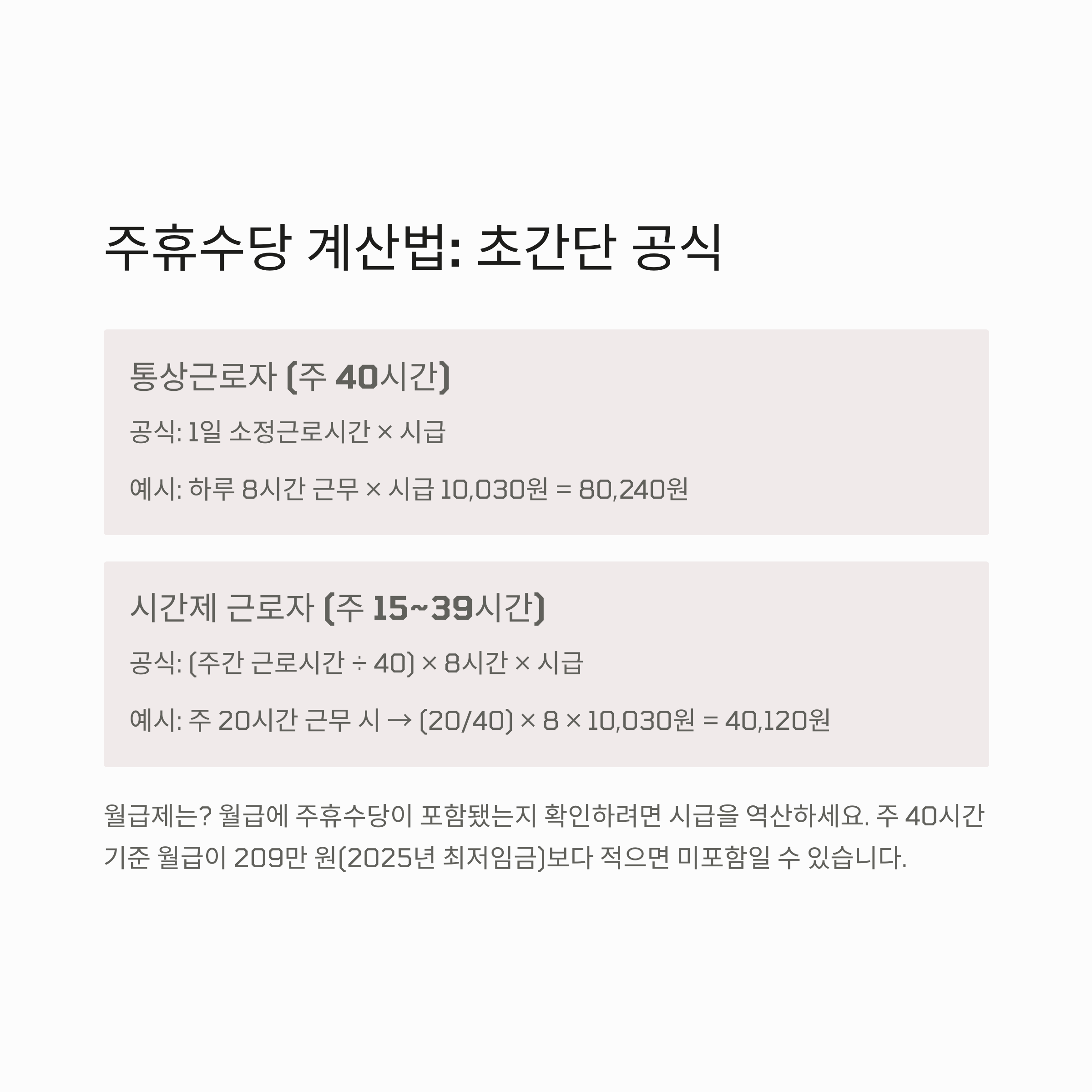 📊 월급제는?: 월급에 주휴수당이 포함됐는지 확인하려면 시급을 역산하세요. 주 40시간 기준 월급이 209만 원(2025년 최저임금)보다 적으면 미포함일 수 있어요.