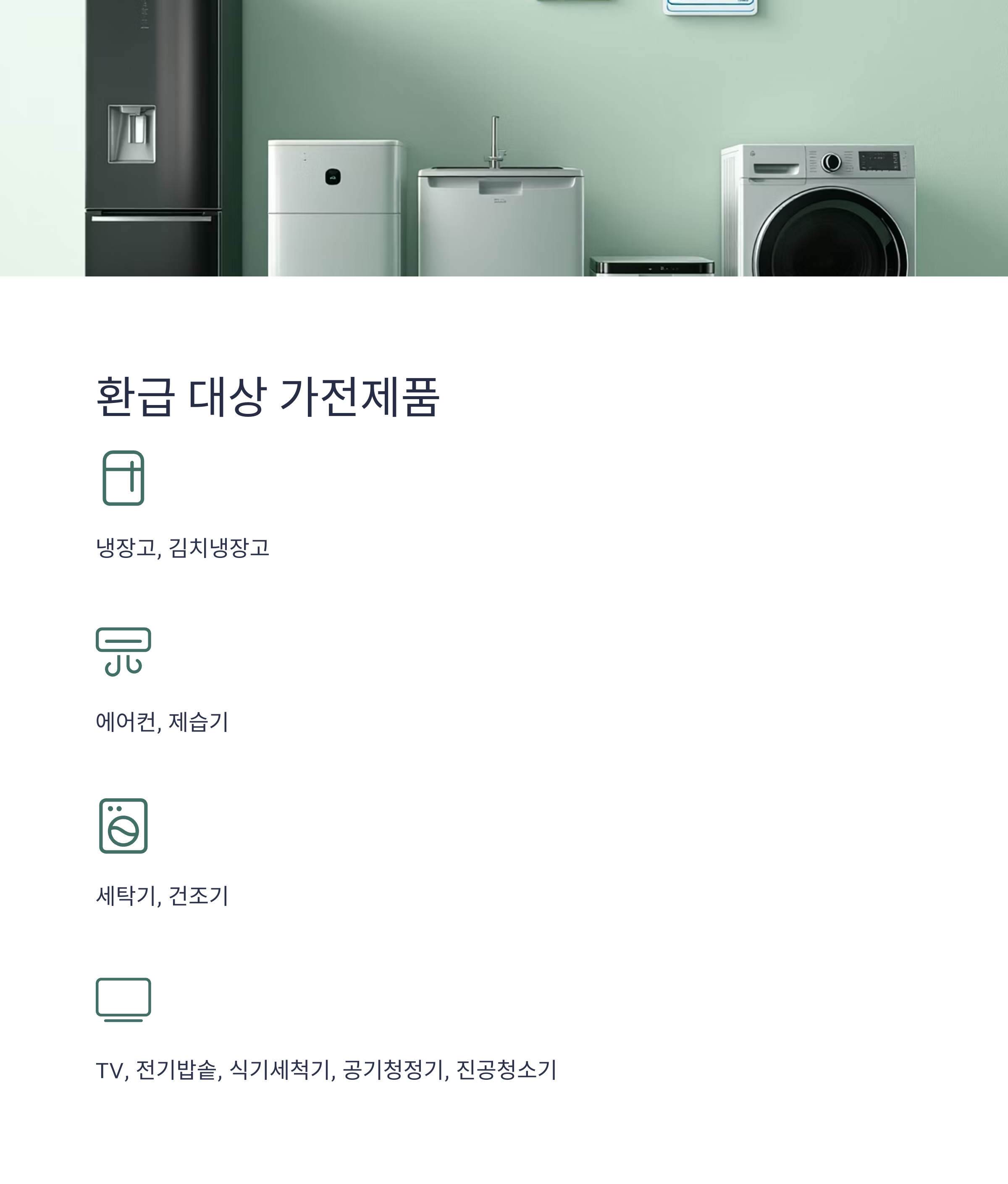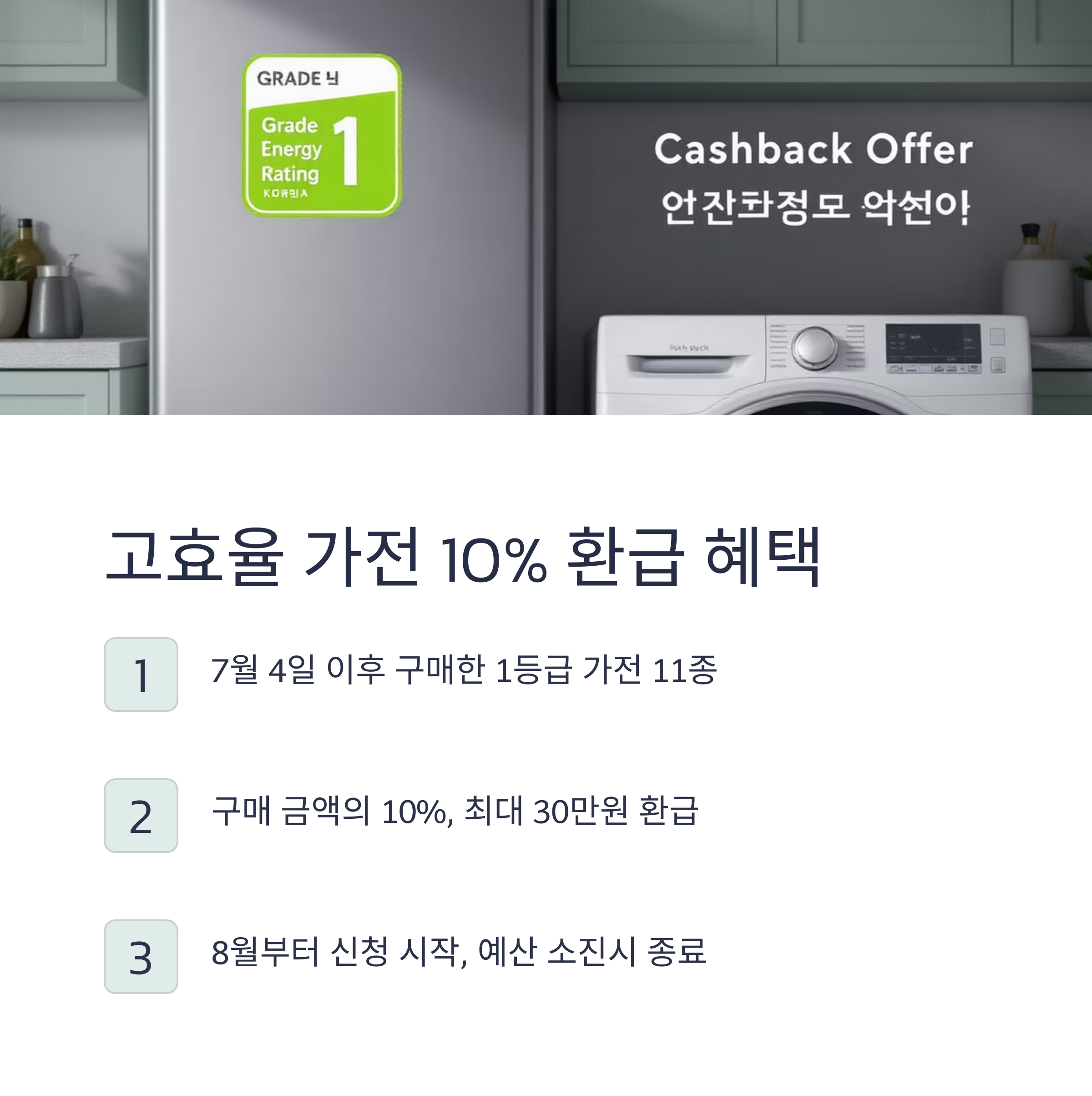 • 7월 4일 이후 구매한 1등급 가전 (냉장고, 에어컨, 세탁기, 전기밥솥, TV, 제습기, 건조기, 식기세척기, 공기청정기, 김치냉장고, 진공청소기 등 총 11종)