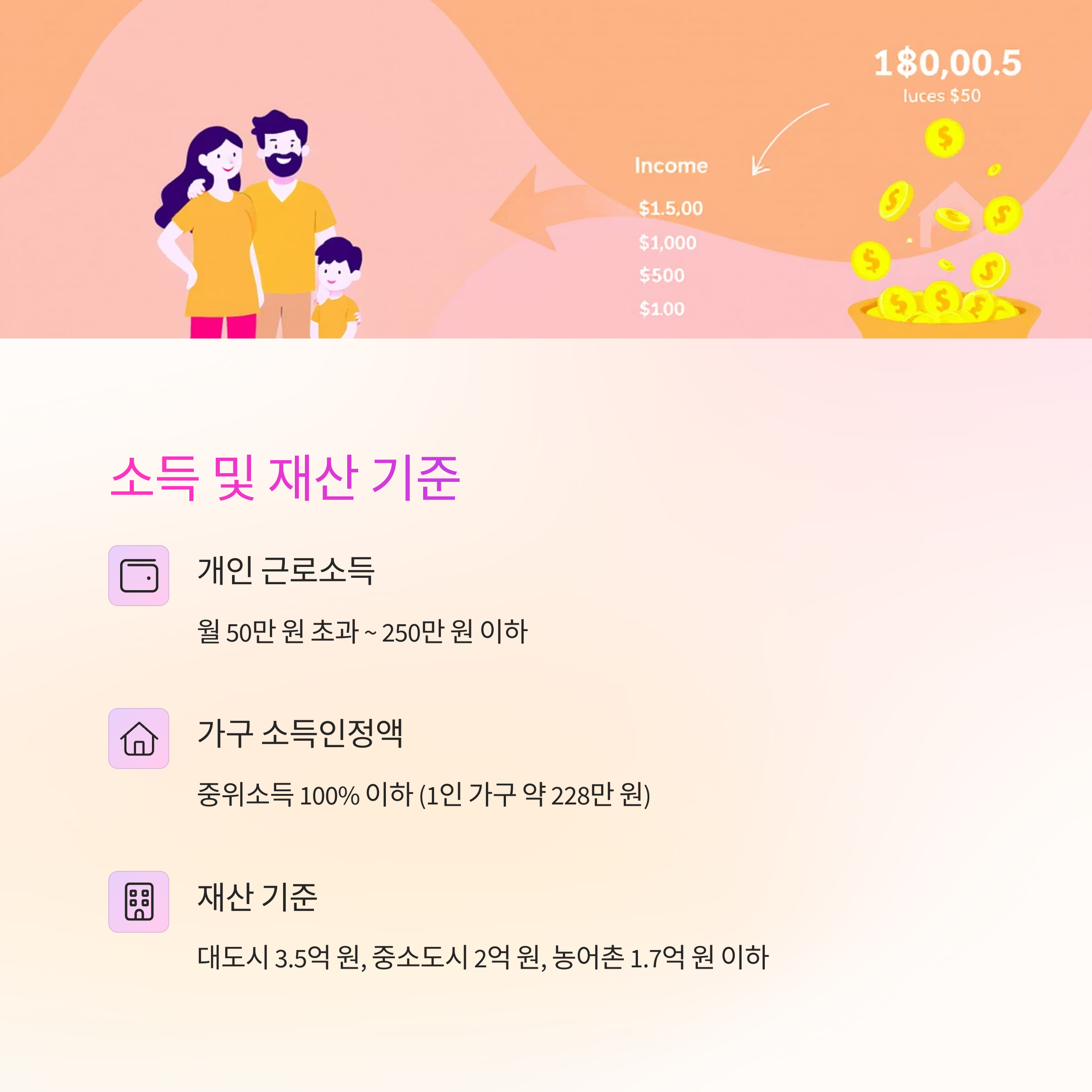 • 재산: 대도시 3.5억 원, 중소도시 2억 원, 농어촌 1.7억 원 이하.