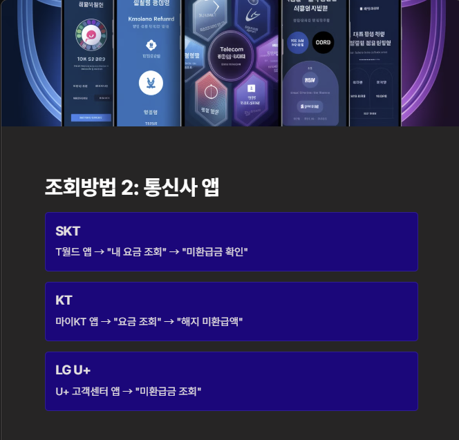 - LG U+: U+ 고객센터 앱 → "미환급금 조회"