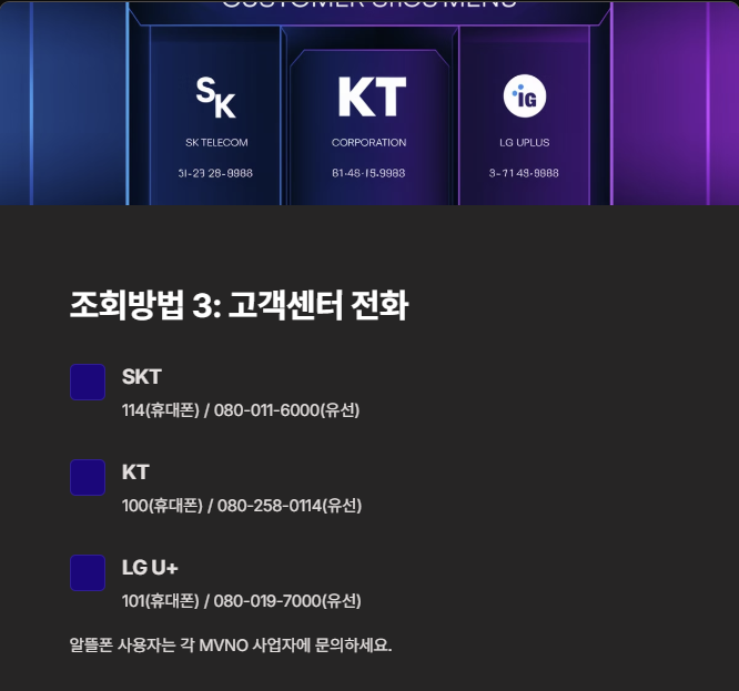 - SKT: 114(휴대폰) / 080-011-6000(유선)