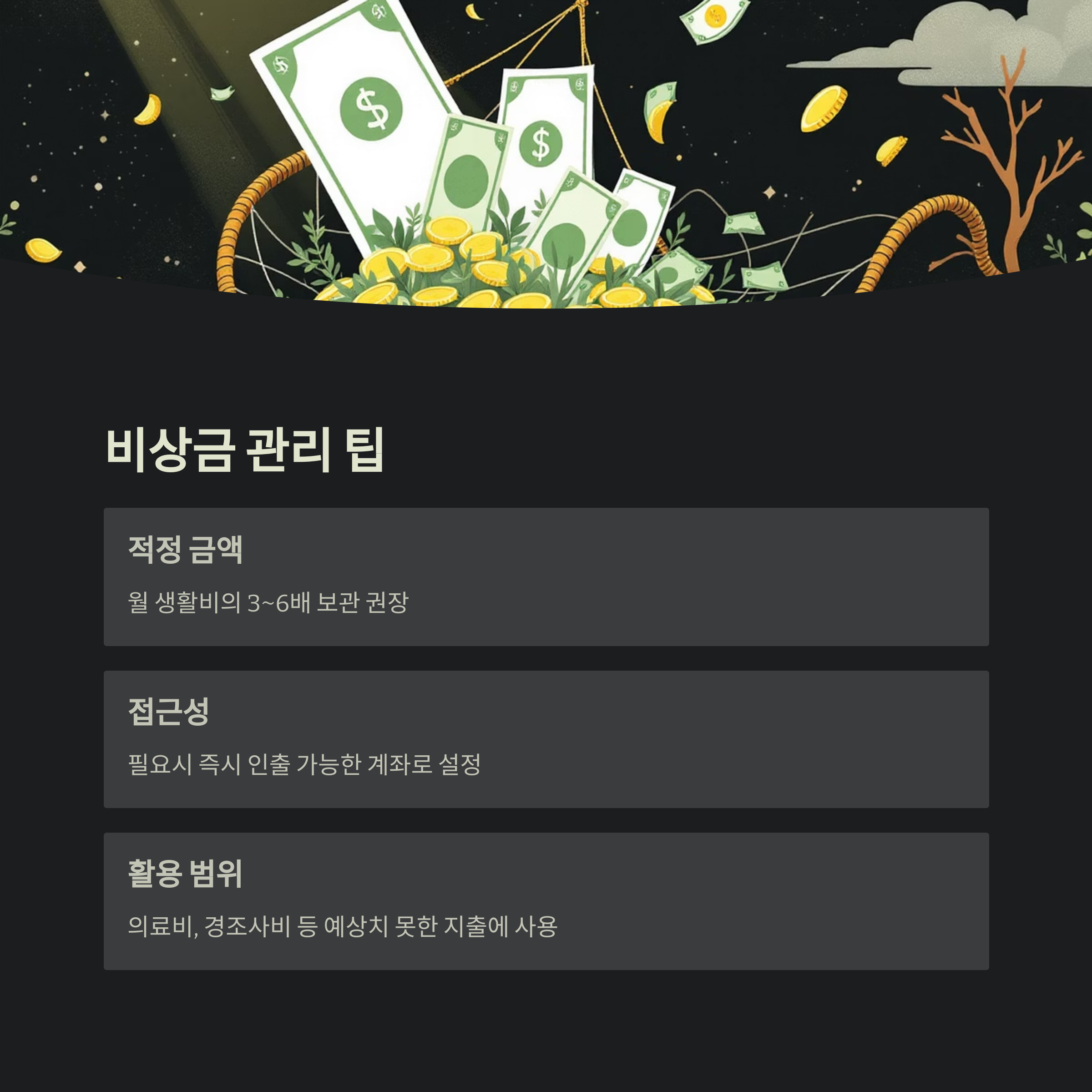- 비상 상황 대비: 비상금 통장을 통해 예기치 않은 지출에 대비할 수 있습니다.